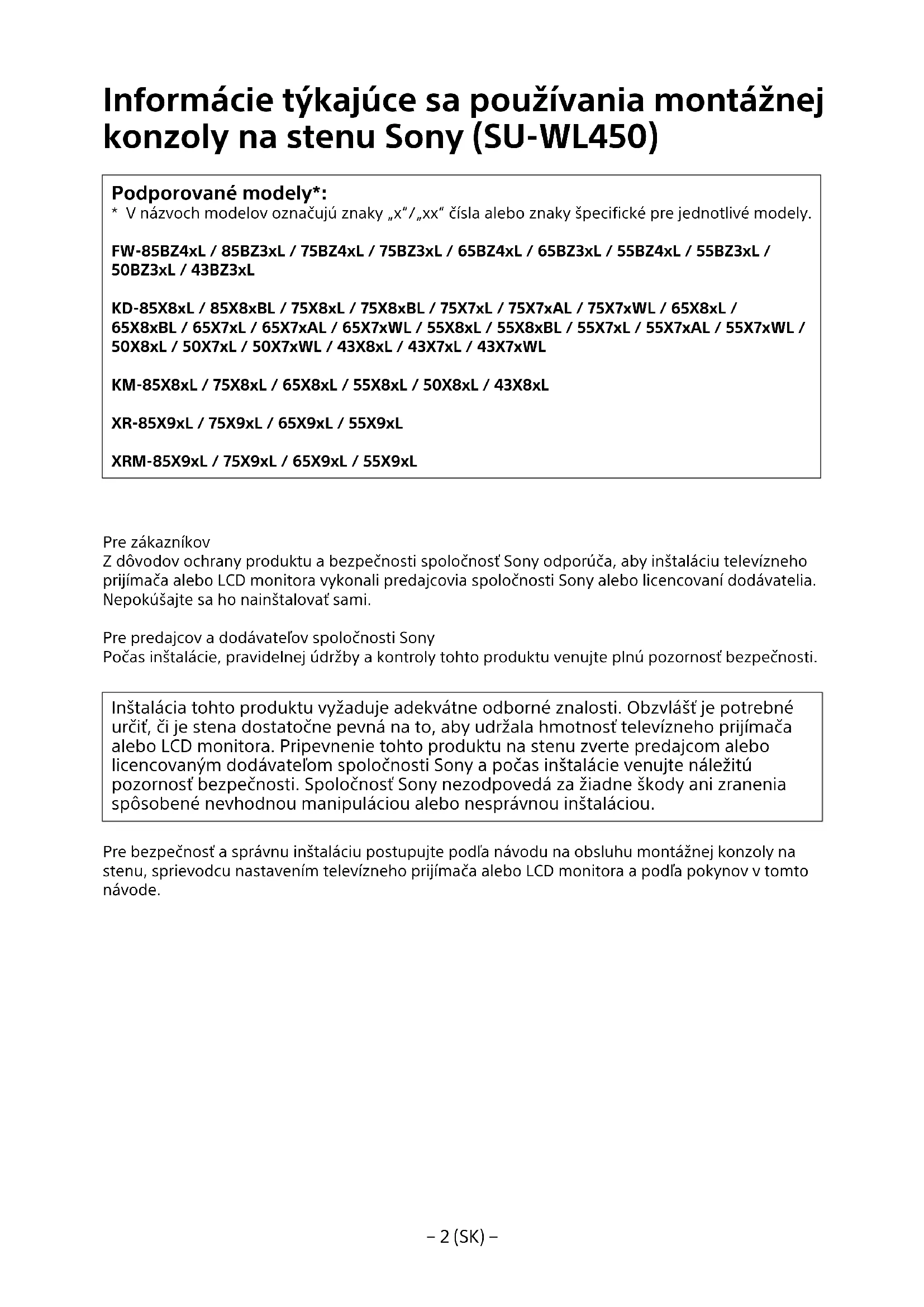 - V názvoch modelov označujú znaky „x“/„xx“ čísla alebo znaky špecifické pre jednotlivé modely. FW-85BZ4xL / 85BZ3xL / 75BZ4xL / 75BZ3xL / 65BZ4xL / 65BZ3xL / 55BZ4xL / 55BZ3xL / 50BZ3xL / 43BZ3xL KD-85X8xL / 85X8xBL / 75X8xL / 75X8xBL / 75X7xL / 75X7xAL / 75X7xWL / 65X8xL / 65X8xBL / 65X7xL / 65X7xAL / 65X7xWL / 55X8xL / 55X8xBL / 55X7xL / 55X7xAL / 55X7xWL / 50X8xL / 50X7xL / 50X7xWL / 43X8xL / 43X7xL / 43X7xWL KM-85X8xL / 75X8xL / 65X8xL / 55X8xL / 50X8xL / 43X8xL XR-85X9xL / 75X9xL / 65X9xL / 55X9xL XRM-85X9xL / 75X9xL / 65X9xL / 55X9xL Pre zákazníkov Z dôvodov ochrany produktu a bezpečnosti spoločnosť Sony odporúča, aby inštaláciu televízneho prijímača alebo LCD monitora vykonali predajcovia spoločnosti Sony alebo licencovaní dodávatelia. Nepokúšajte sa ho nainštalovať sami. Pre predajcov a dodávateľov spoločnosti Sony Počas inštalácie, pravidelnej údržby a kontroly tohto produktu venujte plnú pozornosť bezpečnosti. Inštalácia tohto produktu vyžaduje adekvátne odborné znalosti. Obzvlášť je potrebné určiť, či je stena dostatočne pevná na to, aby udržala hmotnosť televízneho prijímača alebo LCD monitora. Pripevnenie tohto produktu na stenu zverte predajcom alebo licencovaným dodávateľom spoločnosti Sony a počas inštalácie venujte náležitú pozornosť bezpečnosti. Spoločnosť Sony nezodpovedá za žiadne škody ani zranenia spôsobené nevhodnou manipuláciou alebo nesprávnou inštaláciou. Pre bezpečnosť a správnu inštaláciu postupujte podľa návodu na obsluhu montážnej konzoly na stenu, sprievodcu nastavením televízneho prijímača alebo LCD monitora a podľa pokynov v tomto návode.− 3 (SK) −