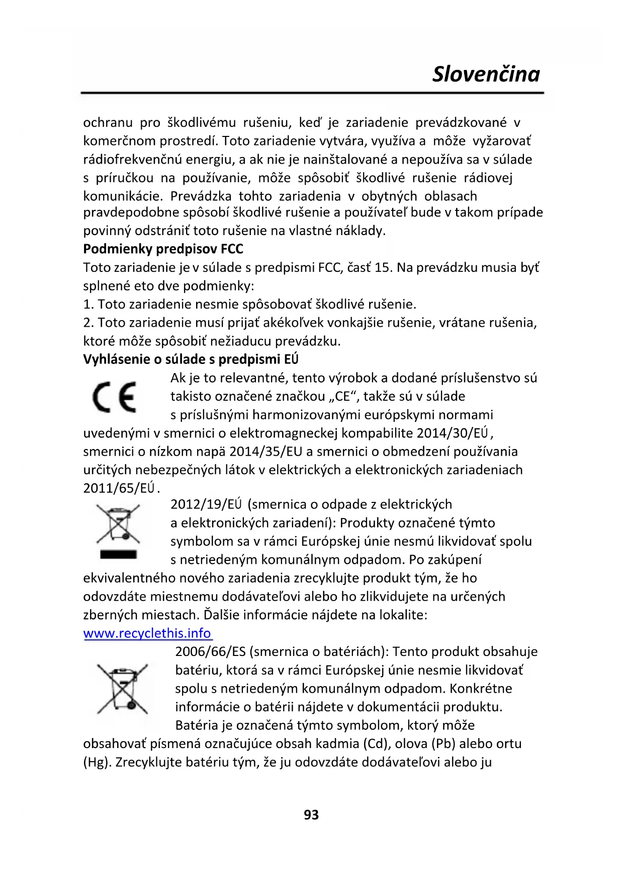 ktoré môže spôsobiť nežiaducu prevádzku. Vyhlásenie o súlade s predpismi EÚ Ak je to relevantné, tento výrobok a dodané príslušenstvo sú takisto označené značkou „CE“, takže sú v súlade s príslušnými harmonizovanými európskymi normami uvedenými v smernici o elektromagnetickej kompatibilite 2014/30/EÚ, smernici o nízkom napätí 2014/35/EU a smernici o obmedzení používania určitých nebezpečných látok v elektrických a elektronických zariadeniach 2011/65/EÚ. 2012/19/EÚ (smernica o odpade z elektrických a elektronických zariadení): Produkty označené týmto symbolom sa v rámci Európskej únie nesmú likvidovať spolu s netriedeným komunálnym odpadom. Po zakúpení ekvivalentného nového zariadenia zrecyklujte produkt tým, že ho odovzdáte miestnemu dodávateľovi alebo ho zlikvidujete na určených zberných miestach. Ďalšie informácie nájdete na lokalite: www.recyclethis.info 2006/66/ES (smernica o batériách): Tento produkt obsahuje batériu, ktorá sa v rámci Európskej únie nesmie likvidovať spolu s netriedeným komunálnym odpadom. Konkrétne informácie o batérii nájdete v dokumentácii produktu. Batéria je označená týmto symbolom, ktorý môže obsahovať písmená označujúce obsah kadmia (Cd), olova (Pb) alebo ortuti (Hg). Zrecyklujte batériu tým, že ju odovzdáte dodávateľovi alebo juSlovenčina