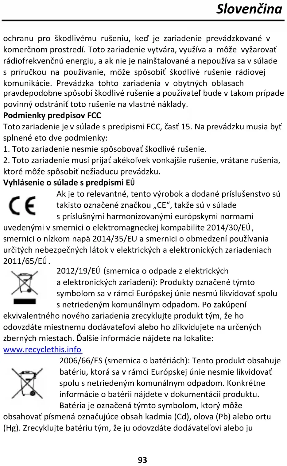 ktoré môže spôsobiť nežiaducu prevádzku. Vyhlásenie o súlade s predpismi EÚ Ak je to relevantné, tento výrobok a dodané príslušenstvo sú takisto označené značkou „CE“, takže sú v súlade s príslušnými harmonizovanými európskymi normami uvedenými v smernici o elektromagnetickej kompatibilite 2014/30/EÚ, smernici o nízkom napätí 2014/35/EU a smernici o obmedzení používania určitých nebezpečných látok v elektrických a elektronických zariadeniach 2011/65/EÚ. 2012/19/EÚ (smernica o odpade z elektrických a elektronických zariadení): Produkty označené týmto symbolom sa v rámci Európskej únie nesmú likvidovať spolu s netriedeným komunálnym odpadom. Po zakúpení ekvivalentného nového zariadenia zrecyklujte produkt tým, že ho odovzdáte miestnemu dodávateľovi alebo ho zlikvidujete na určených zberných miestach. Ďalšie informácie nájdete na lokalite: www.recyclethis.info 2006/66/ES (smernica o batériách): Tento produkt obsahuje batériu, ktorá sa v rámci Európskej únie nesmie likvidovať spolu s netriedeným komunálnym odpadom. Konkrétne informácie o batérii nájdete v dokumentácii produktu. Batéria je označená týmto symbolom, ktorý môže obsahovať písmená označujúce obsah kadmia (Cd), olova (Pb) alebo ortuti (Hg). Zrecyklujte batériu tým, že ju odovzdáte dodávateľovi alebo juSlovenčina