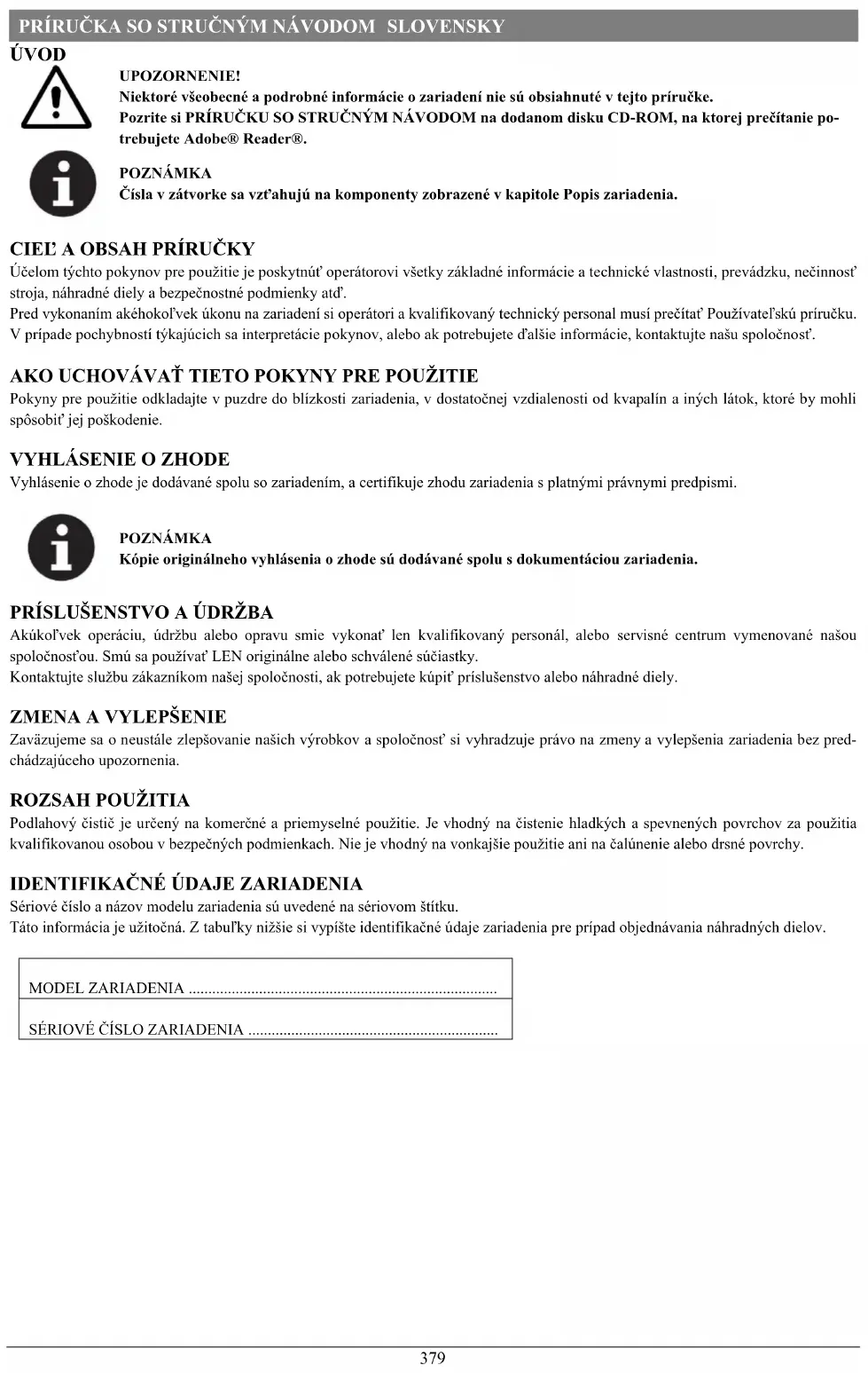 Sériové číslo a názov modelu zariadenia sú uvedené na sériovom štítku. Táto informácia je užitočná. Z tabuľky nižšie si vypíšte identifikačné údaje zariadenia pre prípad objednávania náhradných dielov. MODEL ZARIADENIA ...............................................................................