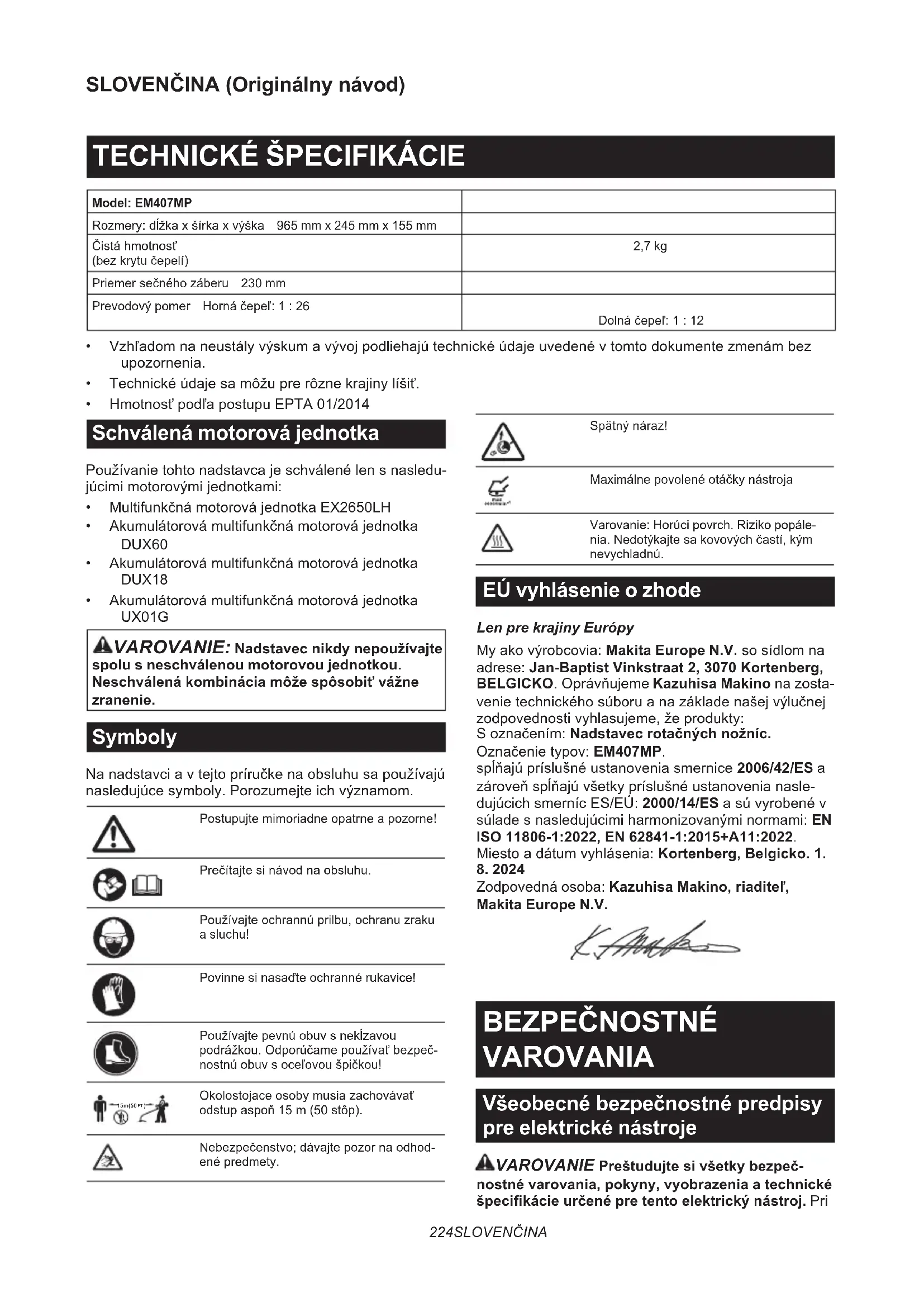 Okolostojaceosobymusiazachovávaťodstupaspoň15m(50stôp).Nebezpečenstvo;dávajtepozornaodhod-enépredmety.Spätnýnáraz!MaximálnepovolenéotáčkynástrojaVarovanie: Horúci povrch. Riziko popále-nia.Nedotýkajtesakovovýchčastí,kýmnevychladnú. EÚ vyhlásenie o zhode Len pre krajiny Európy Myakovýrobcovia:Makita Europe N.V.sosídlomna adrese: Jan-Baptist Vinkstraat 2, 3070 Kortenberg, BELGICKO.OprávňujemeKazuhisa Makino na zosta- venietechnickéhosúboruanazákladenašejvýlučnej zodpovednostivyhlasujeme,žeprodukty: Soznačením:Nadstavec rotačných nožníc. Označenietypov:EM407MP. spĺňajúpríslušnéustanoveniasmernice2006/42/ES a zároveňspĺňajúvšetkypríslušnéustanovenianasle- dujúcichsmernícES/EÚ:2000/14/ESasúvyrobenév súladesnasledujúcimiharmonizovanýminormami:EN ISO 11806-1:2022, EN 62841-1:2015+A11:2022. Miestoadátumvyhlásenia:Kortenberg, Belgicko. 1.