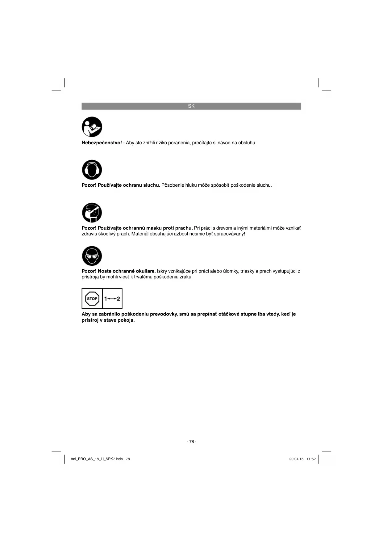 Nebezpečenstvo! - Aby ste znížili riziko poranenia, prečítajte si návod na obsluhu Pozor! Používajte ochranu sluchu. Pôsobenie hluku môže spôsobiť poškodenie sluchu. Pozor! Noste ochranné okuliare. Iskry vznikajúce pri práci alebo úlomky, triesky a prach vystupujúci z prístroja by mohli viesť k trvalému poškodeniu zraku. Pozor! Používajte ochrannú masku proti prachu. Pri práci s drevom a inými materiálmi môže vznikať zdraviu škodlivý prach. Materiál obsahujúci azbest nesmie byť spracovávaný! Aby sa zabránilo poškodeniu prevodovky, smú sa prepínať otáčkové stupne iba vtedy, keď je prístroj v stave pokoja. Anl_PRO_AS_18_Li_SPK7.indb 78Anl_PRO_AS_18_Li_SPK7.indb 78 20.04.15 11:5220.04.15 11:52SK
