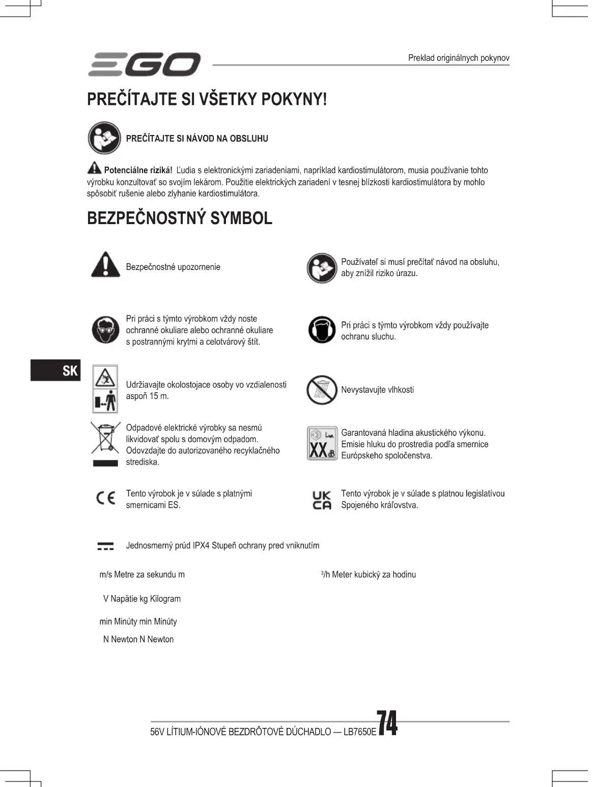 Garantovaná hladina akustického výkonu. Emisie hluku do prostredia podľa smernice Európskeho spoločenstva.Tento výrobok je v súlade s platnými smernicami ES.Tento výrobok je v súlade s platnou legislatívou Spojeného kráľovstva.Jednosmerný prúd IPX4 Stupeň ochrany pred vniknutímm/s Metre za sekundu m /h Meter kubický za hodinuV Napätie kg Kilogrammin Minúty min MinútyN Newton N NewtonPreklad originálnych pokynov56V LÍTIUM-IÓNOVÉ BEZDRÔTOVÉ DÚCHADLO — LB7650E 75