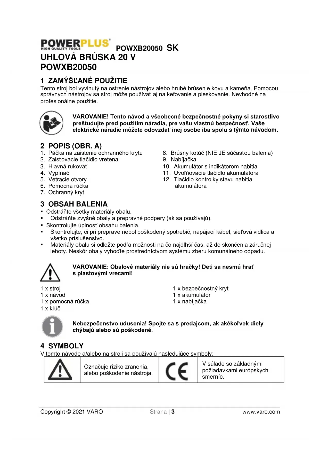 V súlade so základnými požiadavkami európskych smerníc.POWXB20050 SK Copyright © 2021 VARO Strana | 4 www.varo.com