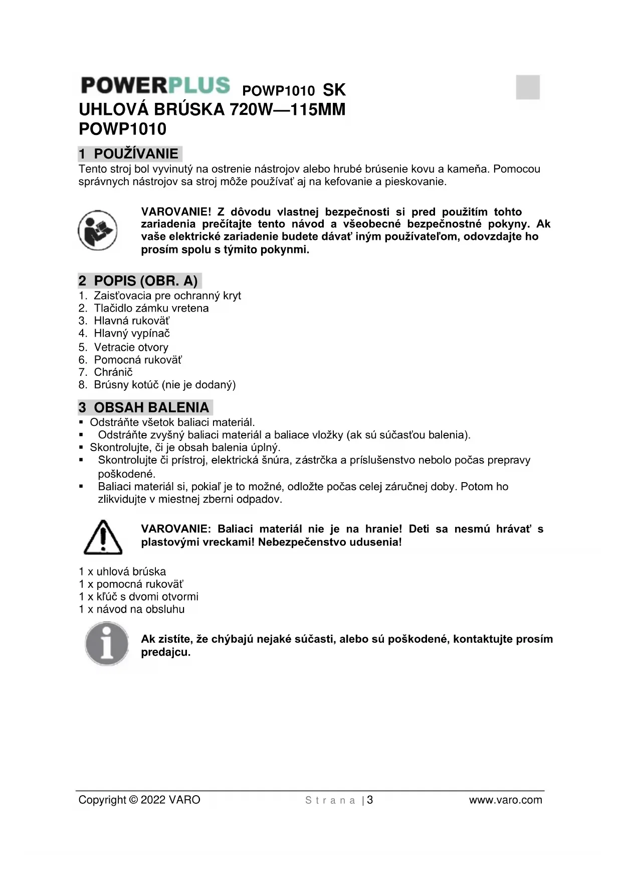 Pred prácou s uhlovou brúskou skontrolujte, či sa napätie zobrazené na modelovom štítku stroja zhoduje s používaným sieťovým napätím. Pred stlačením hlavného vypínača skontrolujte, či je brúsny kotúč správne nainštalovaný a hladko beží a či je vonkajšia príruba dobre utiahnutá.POWP1010 SK Copyright © 2022 VARO S t r a n a | 8 www.varo.com