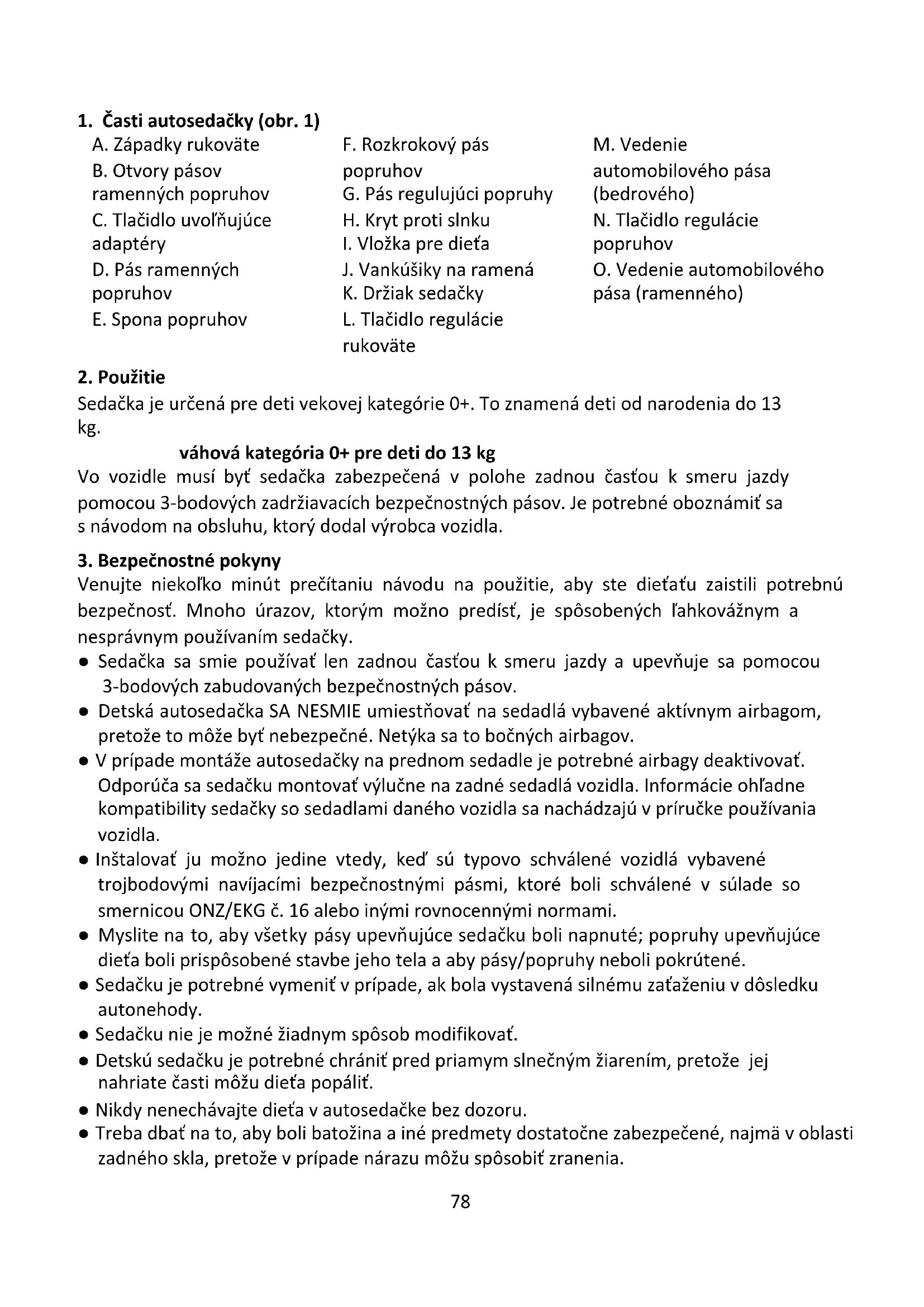Pred prvým použitím autosedačky si pozorne prečítajte návod na použitie. Je vašou povinnosťou zaistiť vášmu dieťaťu bezpečnosť a neprečítanie tohto návodu môže mať na ňu vplyv.78