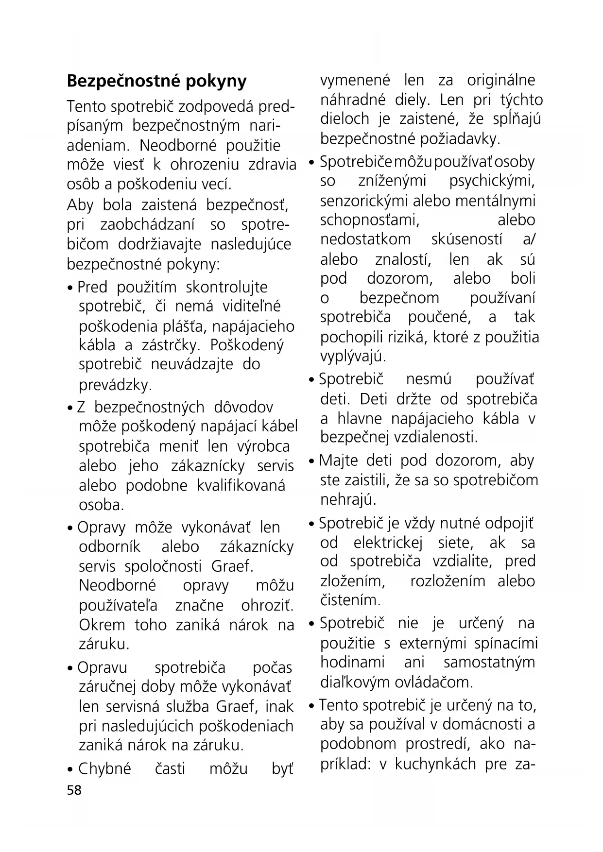 - Opravy môže vykonávať len odborník alebo zákaznícky servis spoločnosti Graef. Neodborné opravy môžu používateľa značne ohroziť. Okrem toho zaniká nárok na záruku.