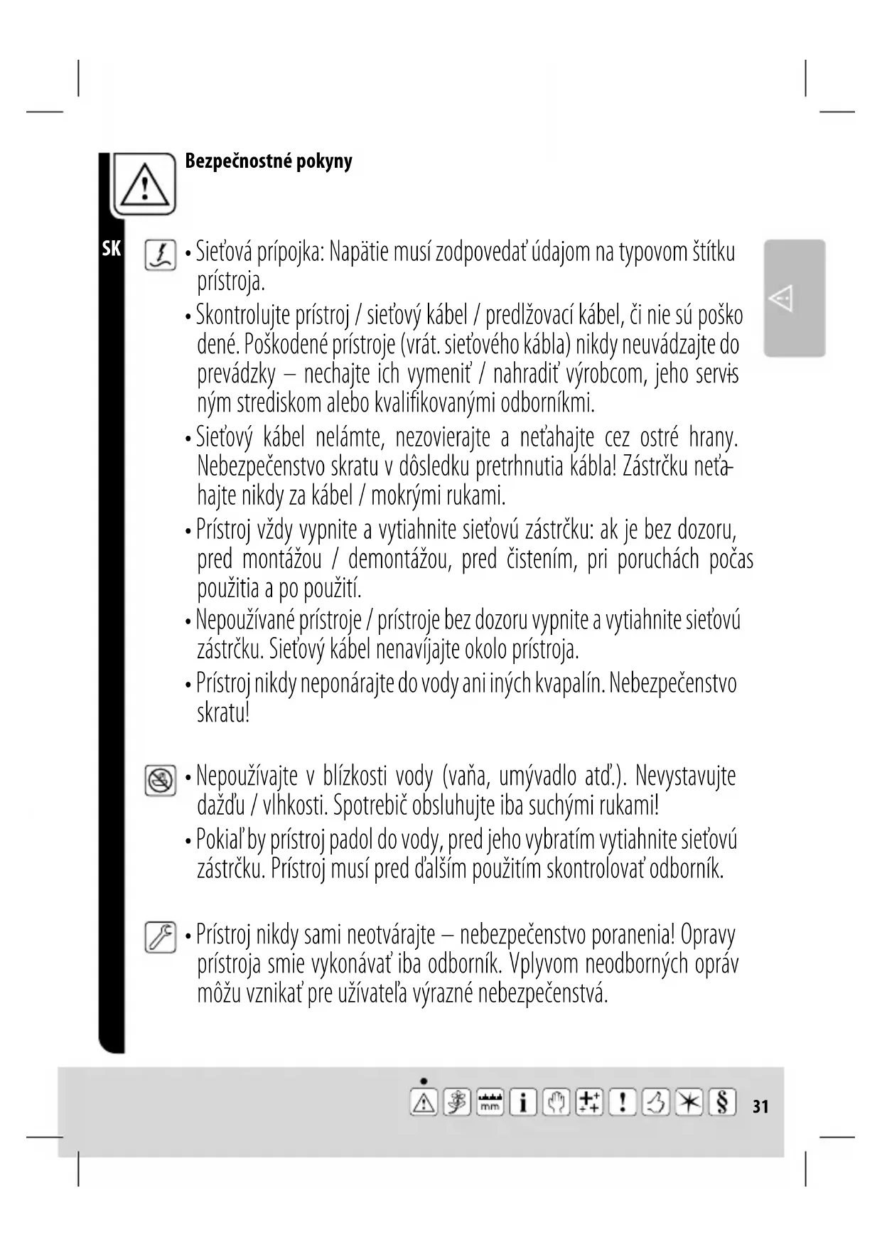 - Prístroj nikdy sami neotvárajte – nebezpečenstvo poranenia! Opravy prístroja smie vykonávať iba odborník. Vplyvom neodborných opráv môžu vznikať pre užívateľa výrazné nebezpečenstvá.32 Bezpečnostné pokyny