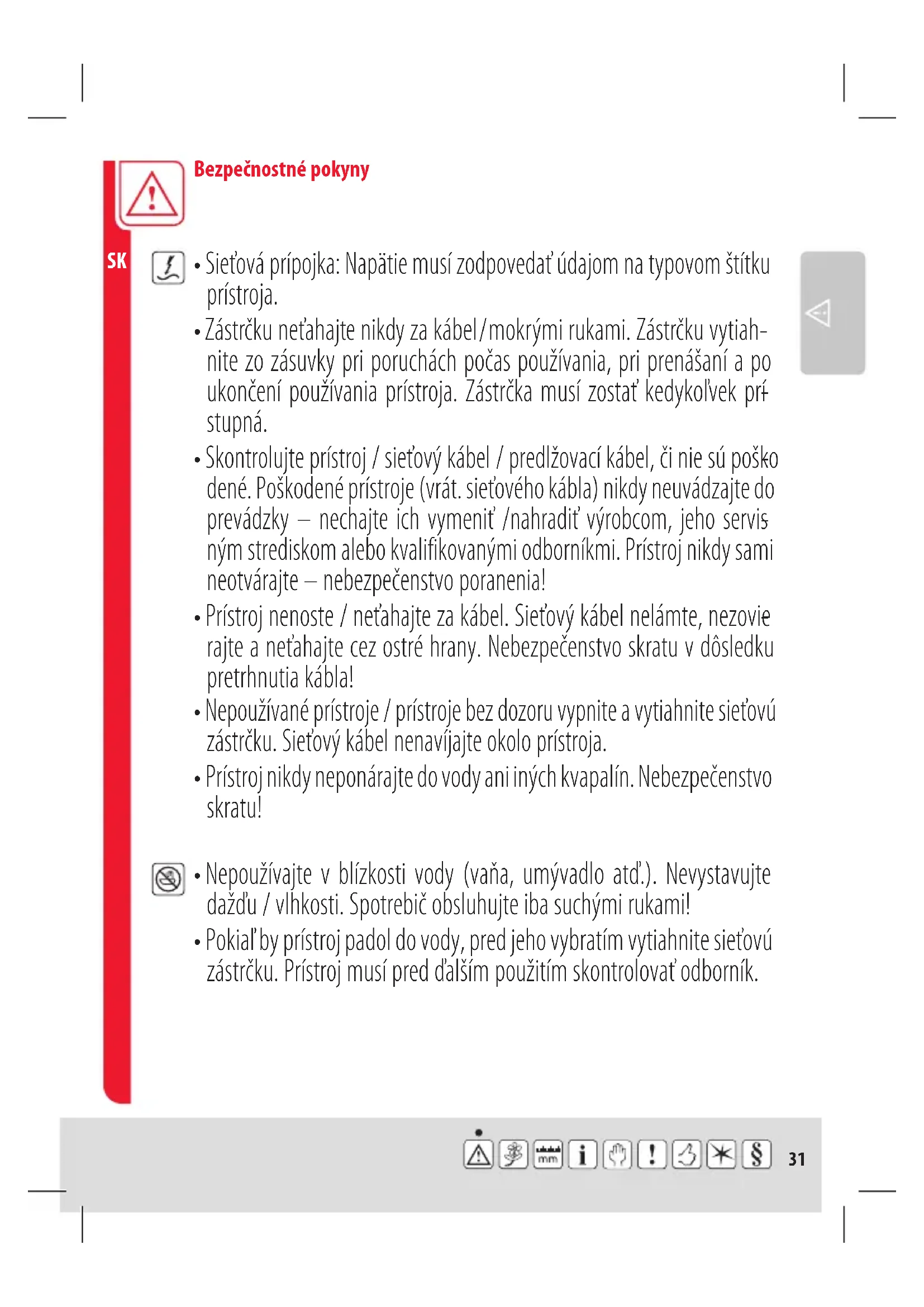 - Prístroj nikdy neponárajte do vody ani iných kvapalín. Nebezpečenstvo skratu!