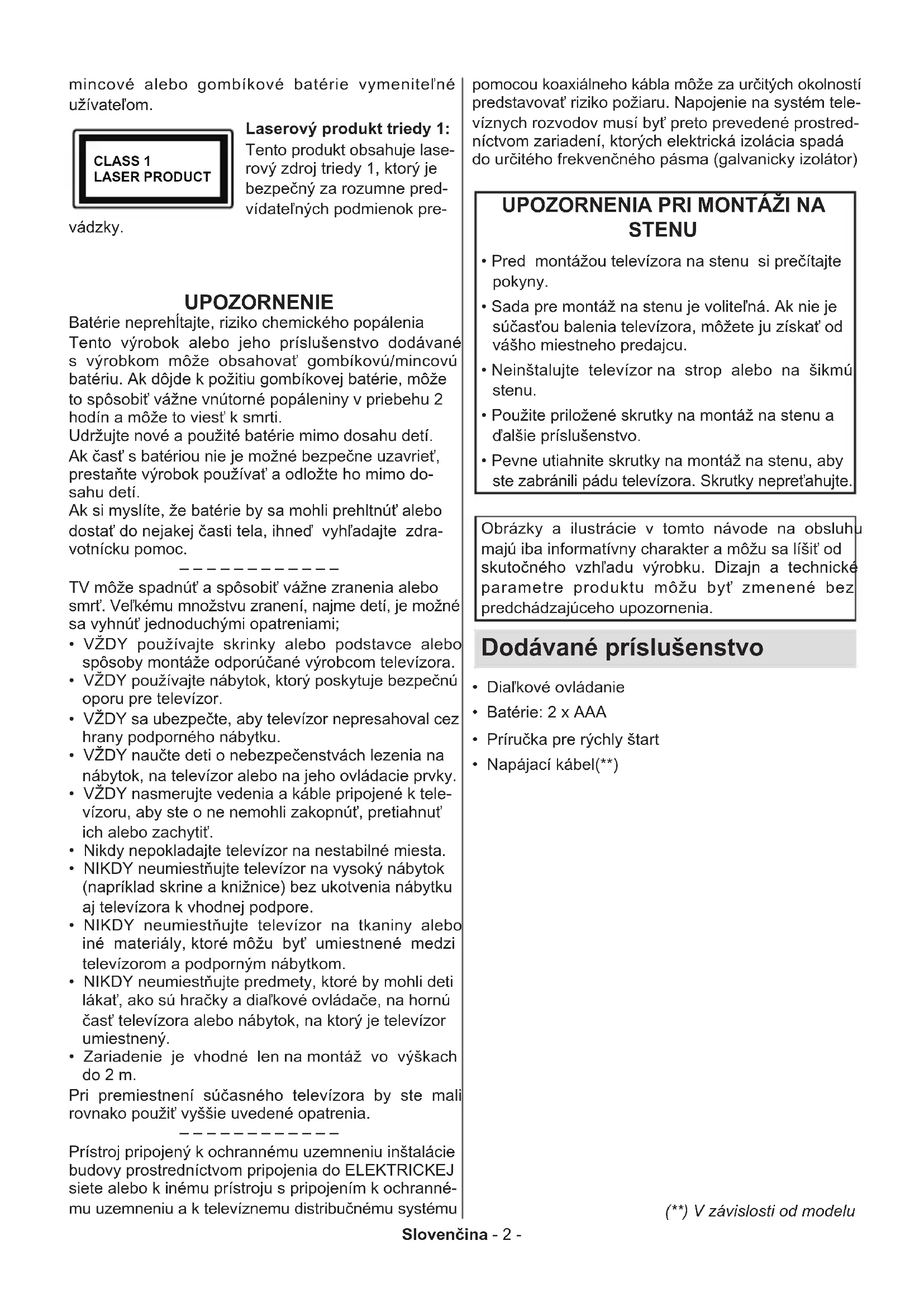 Pozor, Pozri návod na obsluhu: V Slovenčina - 2 - mincové alebo gombíkové batérie vymeniteľné užívateľom. CLASS 1 LASER PRODUCT Laserový produkt triedy 1: Tento produkt obsahuje lase- rový zdroj triedy 1, ktorý je bezpečný za rozumne pred- vídateľných podmienok pre- vádzky. UPOZORNENIE Batérie neprehĺtajte, riziko chemického popálenia Tento výrobok alebo jeho príslušenstvo dodávané s výrobkom môže obsahovať gombíkovú/mincovú batériu. Ak dôjde k požitiu gombíkovej batérie, môže to spôsobiť vážne vnútorné popáleniny v priebehu 2 hodín a môže to viesť k smrti. Udržujte nové a použité batérie mimo dosahu detí. Ak časť s batériou nie je možné bezpečne uzavrieť, prestaňte výrobok používať a odložte ho mimo do- sahu detí. Ak si myslíte, že batérie by sa mohli prehltnúť alebo dostať do nejakej časti tela, ihneď vyhľadajte zdra- votnícku pomoc. – – – – – – – – – – – – TV môže spadnúť a spôsobiť vážne zranenia alebo smrť. Veľkému množstvu zranení, najme detí, je možné sa vyhnúť jednoduchými opatreniami;