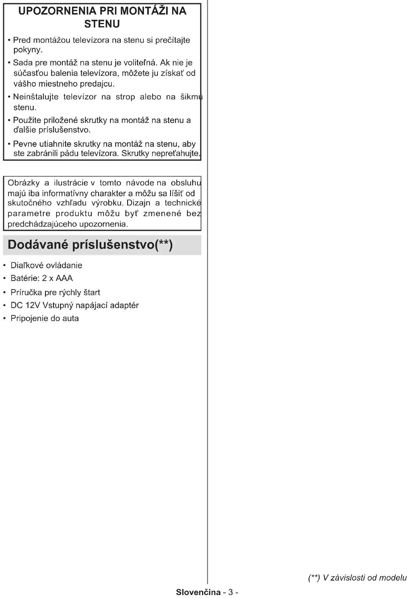 - Pevne utiahnite skrutky na montáž na stenu, aby ste zabránili pádu televízora. Skrutky nepreťahujte. Obrázky a ilustrácie v tomto návode na obsluhu majú iba informatívny charakter a môžu sa líšiť od skutočného vzhľadu výrobku. Dizajn a technické parametre produktu môžu byť zmenené bez predchádzajúceho upozornenia. Dodávané príslušenstvo(**)