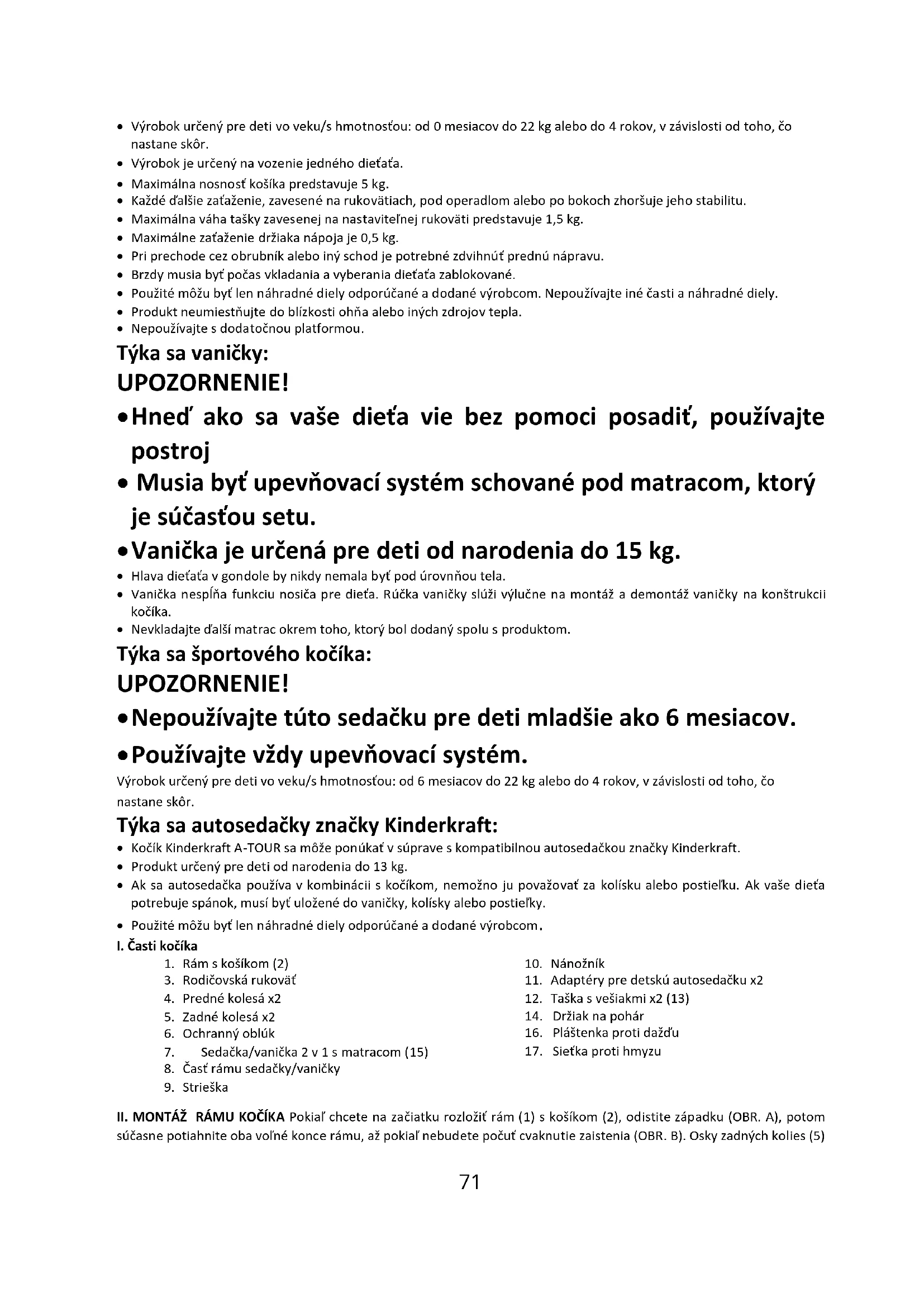 zasuňte do stredovej spony, kým nezacvaknú na miesto (OBR. JJ). Bezpečnostné pásy musia byť zakaždým nastavené tak, aby bolo dieťa správne zaistené. Rozopínanie bezpečnostných pásov musíme začať od stlačenia tlačidla na rozopnutie spony. Pre najmenšie deti, ktoré sa ešte nevedia samé posadiť, pásy vo verzii vaničky musia byť skryté pod matracom. Sedačka / vanička má upevňovacie body pre prídavný postroj. Ramenné popruhy je možné namontovať v jednej z dvoch výšok. XII STAROSTLIVOSŤ A ÚDRŽBA Povinnosťou majiteľa kočíka je zabezpečiť správnu inštaláciu všetkých funkčných prvkov, reguláciu a potrebnú starostlivosť tak, aby ho bolo možné udržať v dobrom technickom stave. Kočík je potrebné pravidelne kontrolovať z hľadiska potenciálnych problémov. Nižšie sú uvedené dôležité činnosti, ktoré je potrebné vykonávať z hľadiska zaistenia bezpečnosti dieťaťa a dlhej životnosti produktu: