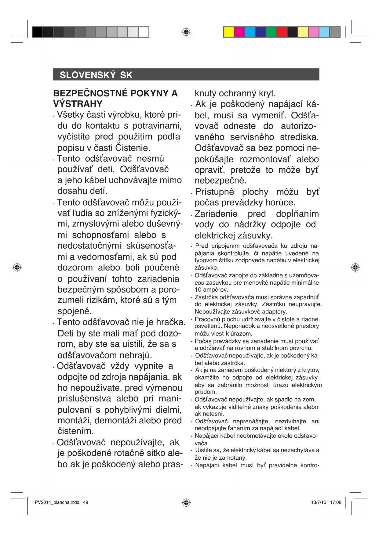 PV2014_plancha.indd 52 13/7/16 17:08Pri vykonávaní tejto cinnosti dávajte pozor, pretože voda a para sú horúce a môžu spôsobit popálenin. 7 Žehlicku dajte do vertikálnej polohy a pockaj- te, kým úplne nevychladne. 8 Žehliacu plochu vycistite vlhkou látkou. + Pamätajte, že poškodenia spôsobené vply- vom vodného kamena nie sú zahrnuté v záruke. Tento symbol znamená, že si musíte prečí- tať návod na obsluhu. Tento symbol znamená, že používateľ si musí pred použitím dôkladne prečítať návod na použitie. Tento symbol znamená, že zariadenie nes- mie byť zakryté. Tento symbol znamená, že povrch môže byť počas prevádzky horúci. Tento prístroj je v súlade so smernicou č. 2014/35/ES o nízkom napätí, smernicou č. 2014/30/ES o elektromagnetickej kompatibilite, smernicou č. 2011/65/EÚ o obmedzení používa- nia určitých nebezpečných látok v elektrických a elektronických zariadeniach a smernicou č. 2009/125/ES o požiadavkách na ekodizajn výro- bkov využívajúcich energiu.