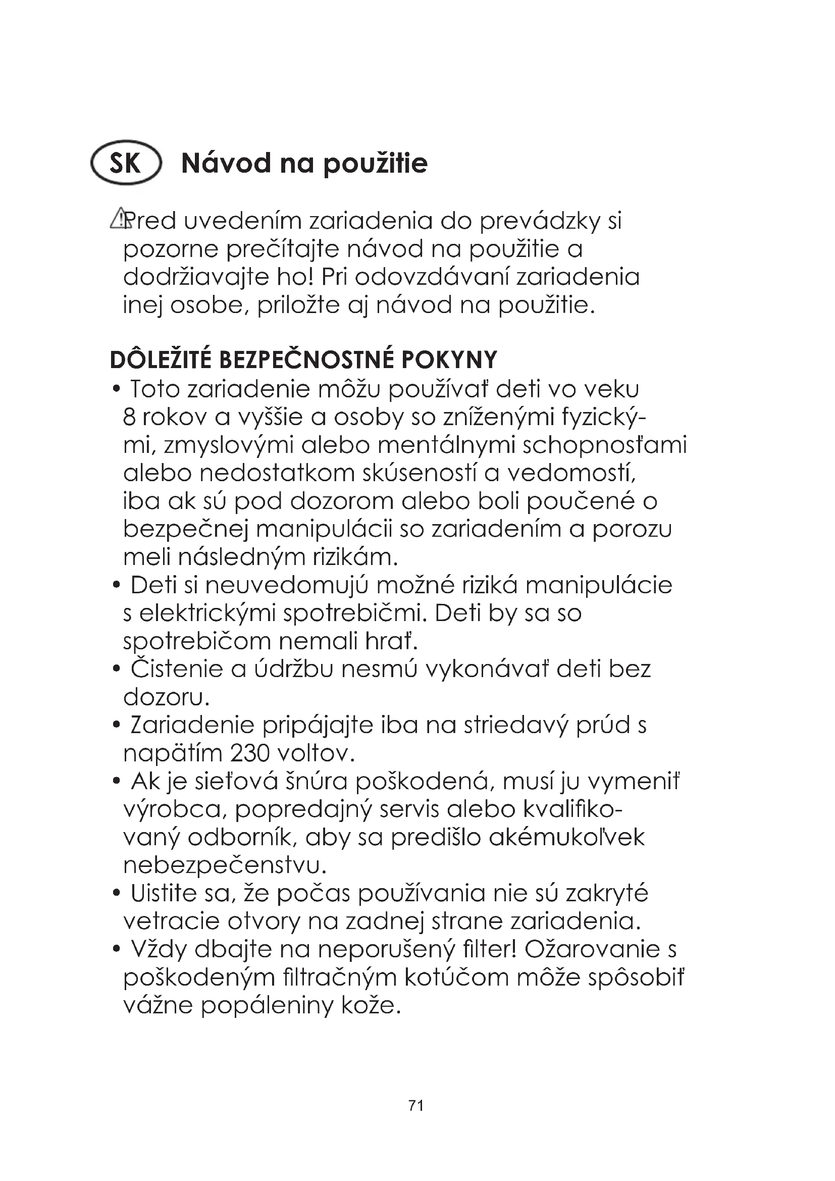 - Ak je sieťová šnúra poškodená, musí ju vymeniť výrobca, popredajný servis alebo kvaliko- vaný odborník, aby sa predišlo akémukoľvek nebezpečenstvu.
