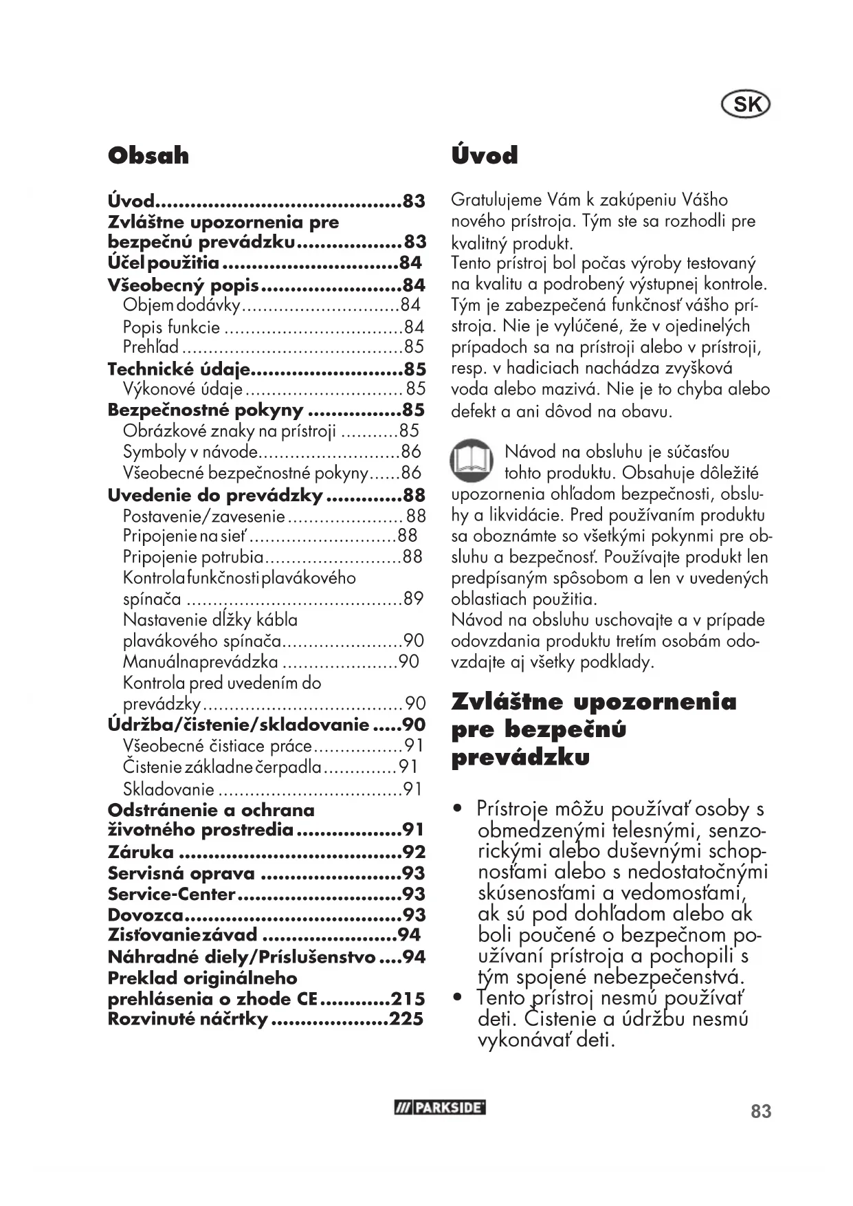 Záruka Vážená zákazníčka, vážený zákazník, Pre tento prístroj platí záruka 3 roky od dátumu zakúpenia. Ak je prístroj poškodený, podľa zákona máte právo ho reklamovať u výrobcu pro- duktu. Tieto práva vyplývajúce zo zákona nie sú našou následne opísanou zárukou obmedzené. Záručné podmienky Záručná lehota začína dňom zakúpenia. Pokladničný doklad ako originál prosím starostlivo uschovajte. Je potrebný ako dô- kaz o zakúpení. Ak sa počas troch rokov od dátumu zakú- penia tohto produktu vyskytne materiálna alebo výrobná chyba, produkt - podľa náš- ho rozhodnutia - bezplatne opravíme alebo nahradíme. Predpokladom záruky je, že v priebehu trojročnej lehoty bude predložený poškodený prístroj a pokladničný doklad a stručne opísaná chyba a kedy sa vyskytla. Ak sa v rámci našej záruky chyba pokryje, obdržíte späť opravený alebo nový prístroj. S opravou alebo výmenou produktu sa ne- začína nová záručná doba. Záručná doba a nárok na odstrá- nenie vady Záručná doba sa poskytnutím záruky nepredlžuje. To platí aj pre nahradené a opravené diely. Prípadné škody a ne- dostatky vzniknuté už pri zakúpení sa musia ihneď po vybalení ohlásiť. Opravy vykonané po uplynutí záručnej doby sú spoplatnené. Rozsah záruky Prístroj bol vyrobený podľa prísnych smer- níc kvality a pred dodaním bol svedomite kontrolovaný. Záruka sa týka materiálových alebo vý- robných chýb. Táto záruka sa nevzťahuje na diely produktu, ktoré sú vystavené normálnemu opotrebeniu a preto sa môžu považovať za opotrebované diely (napr. uhlov napojenie) alebo na poškodenia na krehkých dieloch (napr. vypínač). Táto záruka zaniká, ak bol produkt po- užívaný poškodený, neodborne alebo nebola vykonávaná údržba. Pre odborné používanie produktu je nutné presne do- držiavať všetky návody uvedené v návode na obsluhu. Bezpodmienečne sa vyhnite používaniu, ktoré sa v návode na obsluhu neodporúča alebo pred ktorým ste boli vystríhaní. Produkt je určený len pre súkromné pou- žitie a nie v oblasti podnikania. Záruka zaniká pri nesprávnom a neodbornom používaní, pri násilnom používaní a pri zásahoch, ktoré neboli vykonané v našej servisnej pobočke. Nárok zo záruky neexistuje predovšet- kým pri čerpaní abrazívnych materiálov (piesku, kameňov) alebo agresívnych tekutín, pri nedodržaní návodu na obsluhu alebo pri použití násilia, pretože tým sa tesnenia, obežné koleso, motor alebo iné časti poškodzujú. Pozor: Ponorné čerpadlá sú odvodňovacie čerpadlá. Ponorné čerpadlo na znečistenú vodu je konštruované tak, aby v rámci svo- jej výkonnostnej triedy čo najrýchlejšie pre- čerpalo resp. odčerpalo určitý objem vody. Ponorné čerpadlá nie sú vhodné na použi- tie ako zavodňovacie čerpadlá (napr. na zavodňovanie záhrad) ani ako čerpadlá v nepretržitej prevádzke (napr. pre vodopá- dy alebo fontány v záhradných jazerách). V prípade použitia ponorného čerpadla na iný účel, než na ktorý je určené, zaniká nárok zo záruky. Nárok zo záruky zaniká93