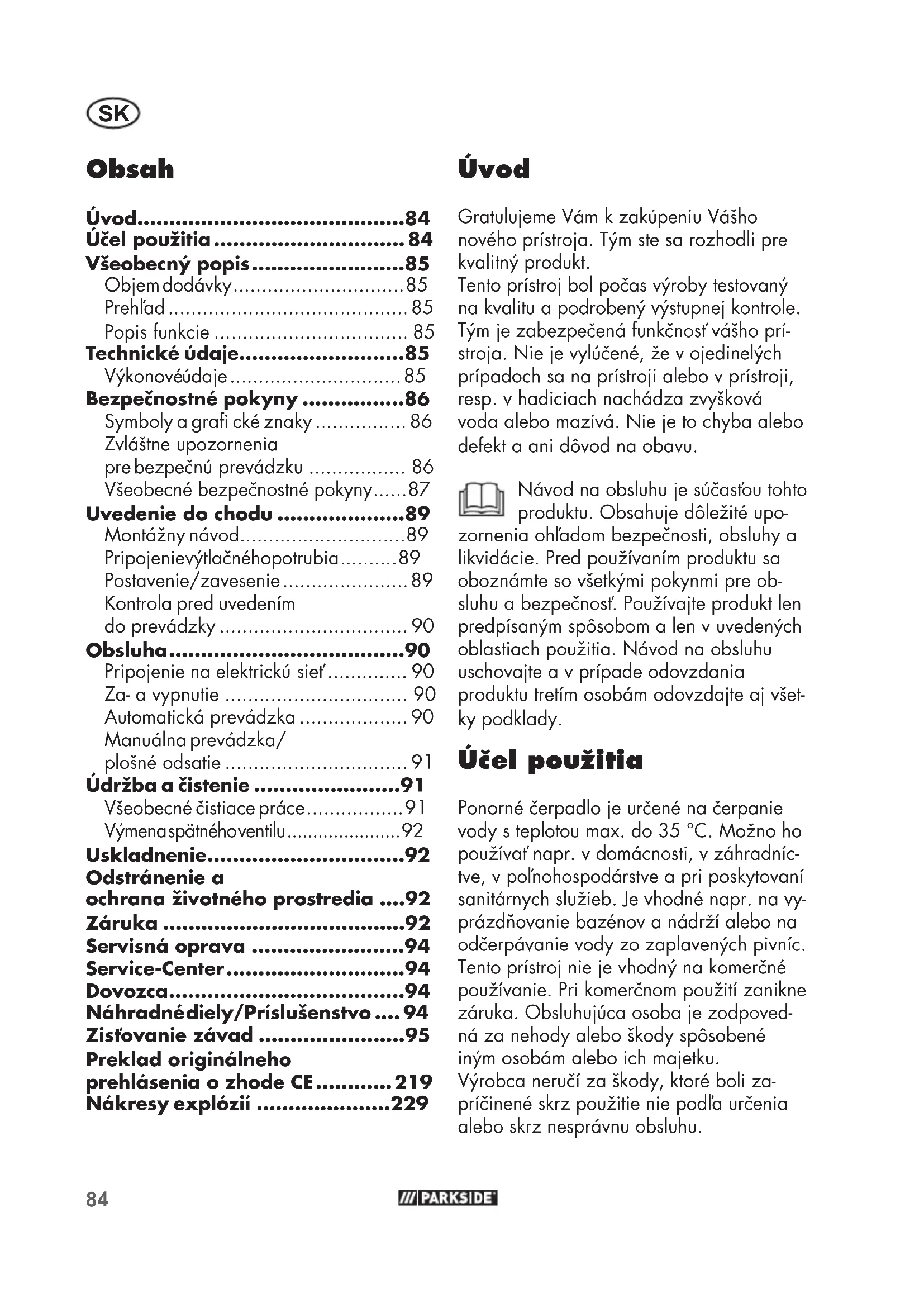 - Úvod Gratulujeme Vám k zakúpeniu Vášho nového prístroja. Tým ste sa rozhodli pre kvalitný produkt. Tento prístroj bol počas výroby testovaný na kvalitu a podrobený výstupnej kontrole. Tým je zabezpečená funkčnosť vášho prí- stroja. Nie je vylúčené, že v ojedinelých prípadoch sa na prístroji alebo v prístroji, resp. v hadiciach nachádza zvyšková voda alebo mazivá. Nie je to chyba alebo defekt a ani dôvod na obavu. Návod na obsluhu je súčasťou tohto produktu. Obsahuje dôležité upo- zornenia ohľadom bezpečnosti, obsluhy a likvidácie. Pred používaním produktu sa oboznámte so všetkými pokynmi pre ob- sluhu a bezpečnosť. Používajte produkt len predpísaným spôsobom a len v uvedených oblastiach použitia. Návod na obsluhu uschovajte a v prípade odovzdania produktu tretím osobám odovzdajte aj všet- ky podklady. Účel použitia Ponorné čerpadlo je určené na čerpanie vody s teplotou max. do 35°C. Možno ho používať napr. v domácnosti, v záhradníc- tve, v poľnohospodárstve a pri poskytovaní sanitárnych služieb. Je vhodné napr. na vy- prázdňovanie bazénov a nádrží alebo na odčerpávanie vody zo zaplavených pivníc. Tento prístroj nie je vhodný na komerčné používanie. Pri komerčnom použití zanikne záruka. Obsluhujúca osoba je zodpoved- ná za nehody alebo škody spôsobené iným osobám alebo ich majetku. Výrobca neručí za škody, ktoré boli za- príčinené skrz použitie nie podľa určenia alebo skrz nesprávnu obsluhu. Obsah Úvod p. 84
