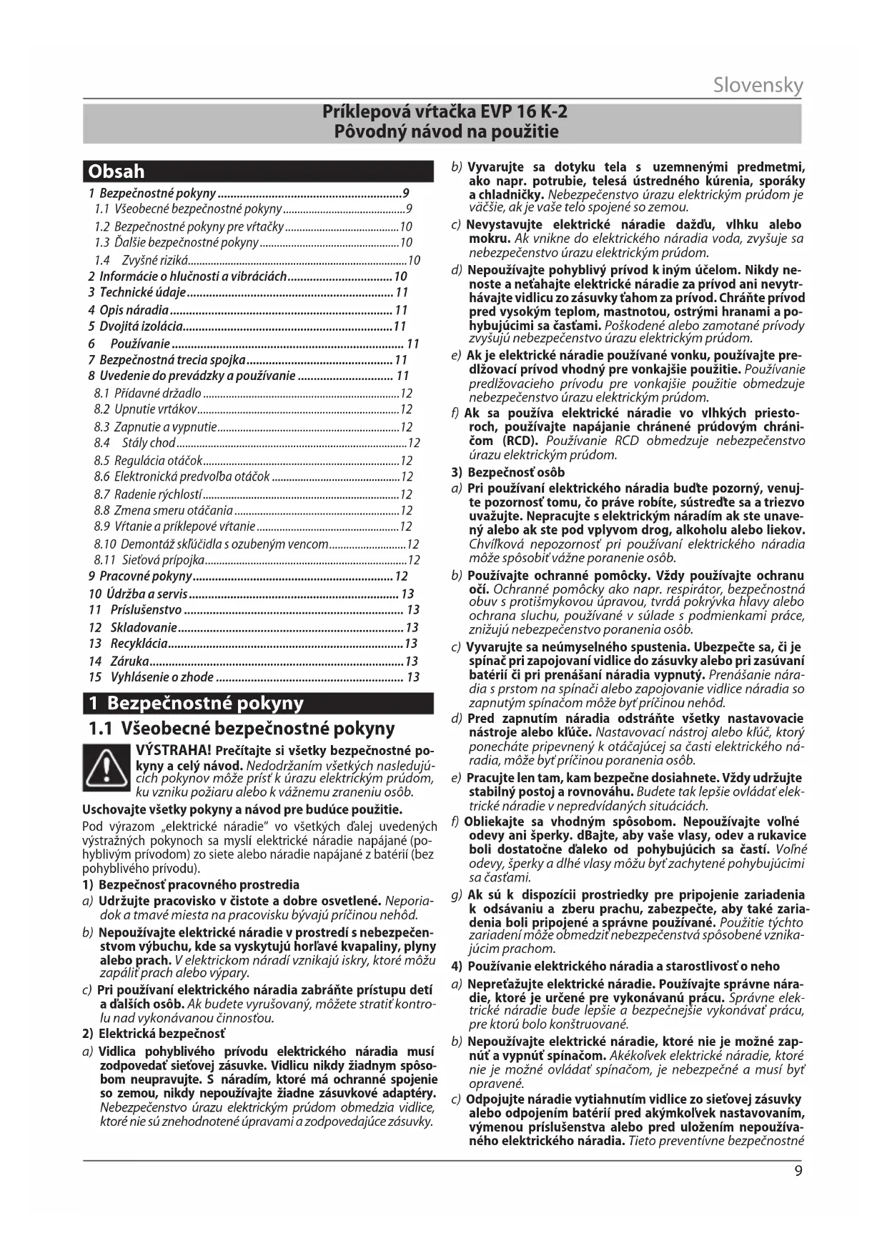 Príklepová vŕtačka EVP16K-2 Pôvodný návod napoužitie Obsah 1 Bezpečnostné pokyny ..........................................................9
