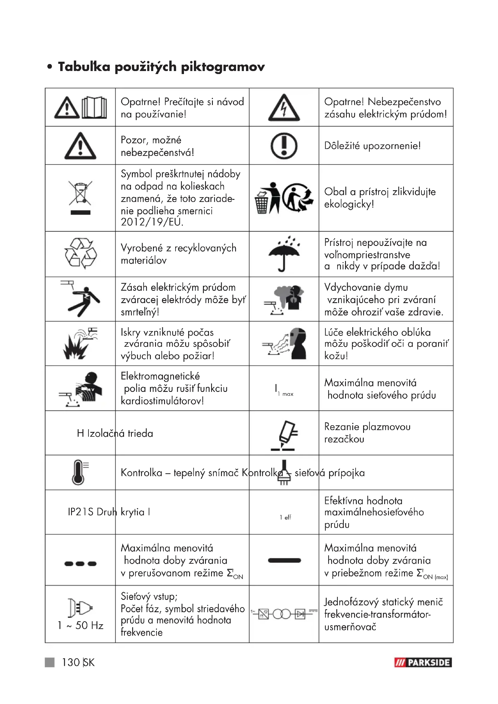 - Tabuľka použitých piktogramov Opatrne! Prečítajte si návod na používanie! Opatrne! Nebezpečenstvo zásahu elektrickým prúdom! Pozor, možné nebezpečenstvá! Dôležité upozornenie! Symbol preškrtnutej nádoby na odpad na kolieskach znamená, že toto zariade- nie podlieha smernici 2012/19/EÚ. Obal a prístroj zlikvidujte ekologicky! Vyrobené zrecyklovaných materiálov Prístroj nepoužívajte na voľnom priestranstve a nikdy v prípade dažďa! Zásah elektrickým prúdom zváracej elektródy môže byť smrteľný! Vdychovanie dymu vznikajúceho pri zváraní môže ohroziť vaše zdravie. Iskry vzniknuté počas zvárania môžu spôsobiť výbuch alebo požiar! Lúče elektrického oblúka môžu poškodiť oči a poraniť kožu!