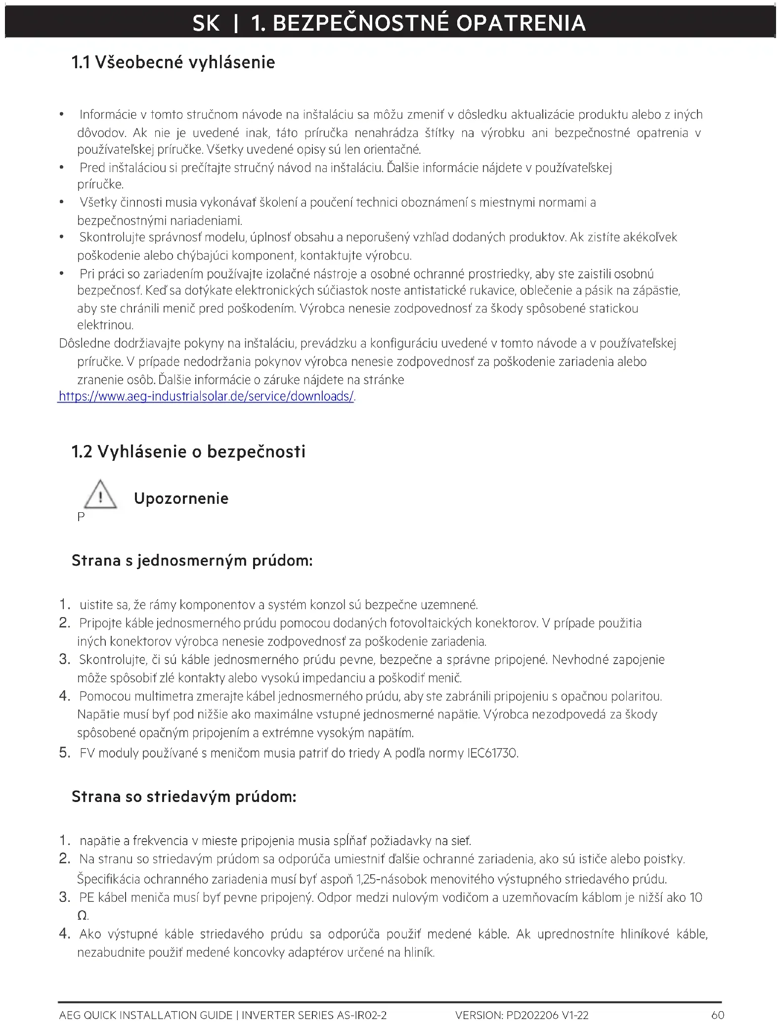 - Pri práci so zariadením používajte izolačné nástroje a osobné ochranné prostriedky, aby ste zaistili osobnú bezpečnosť. Keď sa dotýkate elektronických súčiastok noste antistatické rukavice, oblečenie a pásik na zápästie, aby ste chránili menič pred poškodením. Výrobca nenesie zodpovednosť za škody spôsobené statickou elektrinou. Dôsledne dodržiavajte pokyny na inštaláciu, prevádzku a konfiguráciu uvedené v tomto návode a v používateľskej príručke. V prípade nedodržania pokynov výrobca nenesie zodpovednosť za poškodenie zariadenia alebo zranenie osôb. Ďalšie informácie o záruke nájdete na stránke https://www.aeg-industrialsolar.de/service/downloads/.