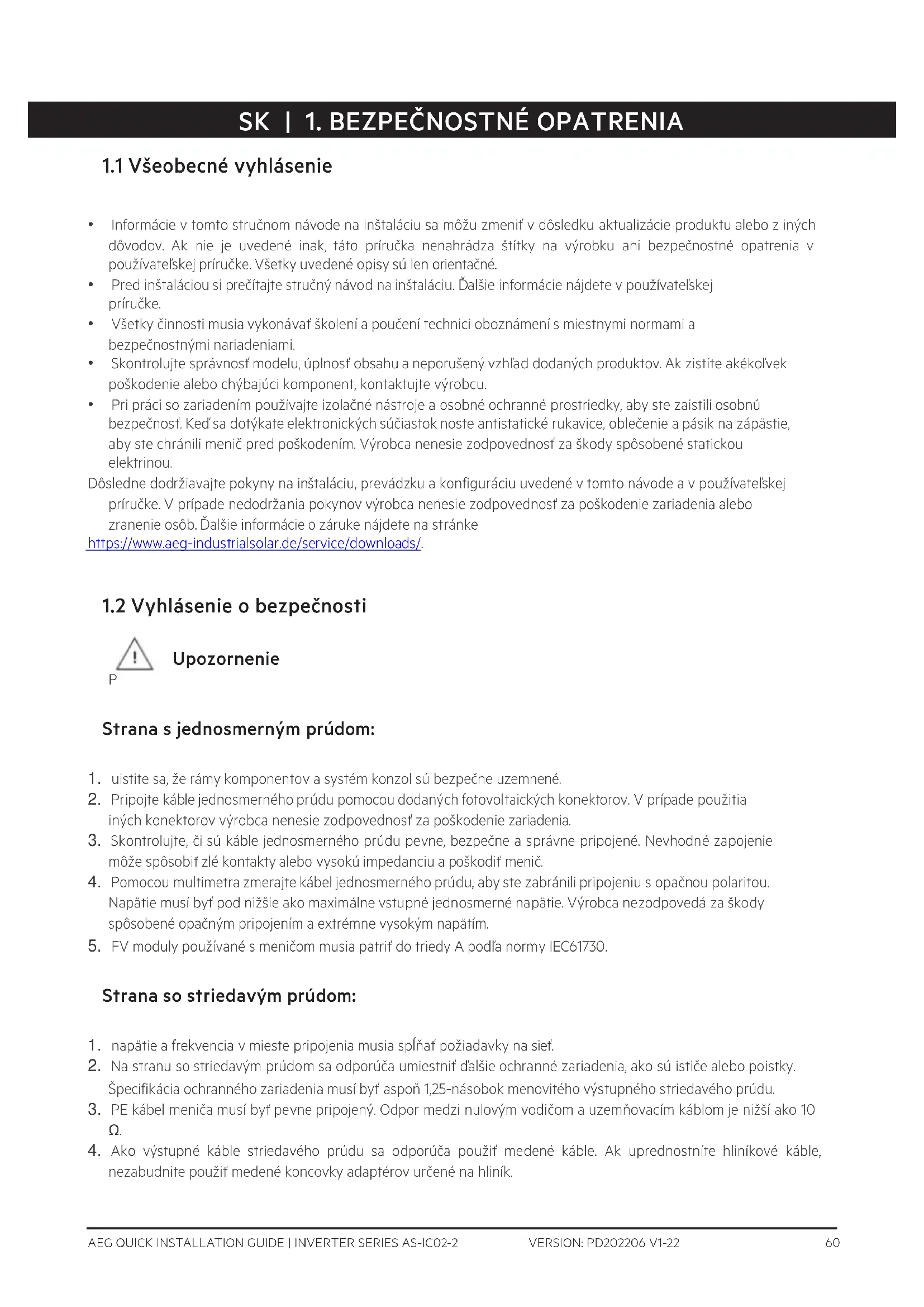 - Pri práci so zariadením používajte izolačné nástroje a osobné ochranné prostriedky, aby ste zaistili osobnú bezpečnosť. Keď sa dotýkate elektronických súčiastok noste antistatické rukavice, oblečenie a pásik na zápästie, aby ste chránili menič pred poškodením. Výrobca nenesie zodpovednosť za škody spôsobené statickou elektrinou. Dôsledne dodržiavajte pokyny na inštaláciu, prevádzku a konfiguráciu uvedené v tomto návode a v používateľskej príručke. V prípade nedodržania pokynov výrobca nenesie zodpovednosť za poškodenie zariadenia alebo zranenie osôb. Ďalšie informácie o záruke nájdete na stránke https://www.aeg-industrialsolar.de/service/downloads/.