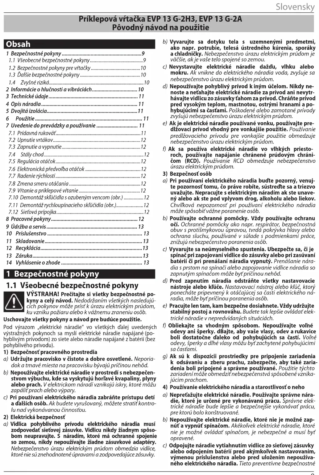 Príklepová vŕtačka EVP13G-2H3, EVP13G-2A Pôvodný návod napoužitie Obsah 1 Bezpečnostné pokyny ..........................................................9