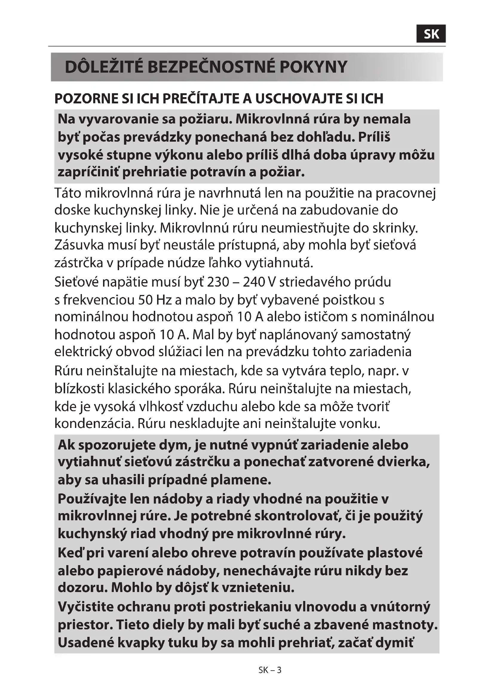 POZORNE SI ICH PREČÍTAJTE A USCHOVAJTE SI ICH Na vyvarovanie sa požiaru. Mikrovlnná rúra by nemala byť počas prevádzky ponechaná bez dohľadu. Príliš vysoké stupne výkonu alebo príliš dlhá doba úpravy môžu zapríčiniť prehriatie potravín a požiar. Táto mikrovlnná rúra je navrhnutá len na použitie na pracovnej doske kuchynskej linky. Nie je určená na zabudovanie do kuchynskej linky. Mikrovlnnú rúru neumiestňujte do skrinky. Zásuvka musí byť neustále prístupná, aby mohla byť sieťová zástrčka v prípade núdze ľahko vytiahnutá. Sieťové napätie musí byť 230 – 240 V striedavého prúdu s frekvenciou 50 Hz a malo by byť vybavené poistkou s nominálnou hodnotou aspoň 10 A alebo ističom s nominálnou hodnotou aspoň 10 A. Mal by byť naplánovaný samostatný elektrický obvod slúžiaci len na prevádzku tohto zariadenia Rúru neinštalujte na miestach, kde sa vytvára teplo, napr. v blízkosti klasického sporáka. Rúru neinštalujte na miestach, kde je vysoká vlhkosť vzduchu alebo kde sa môže tvoriť kondenzácia. Rúru neskladujte ani neinštalujte vonku. Ak spozorujete dym, je nutné vypnúť zariadenie alebo vytiahnuť sieťovú zástrčku a ponechať zatvorené dvierka, aby sa uhasili prípadné plamene. Používajte len nádoby a riady vhodné na použitie v mikrovlnnej rúre. Je potrebné skontrolovať, či je použitý kuchynský riad vhodný pre mikrovlnné rúry. Keď pri varení alebo ohreve potravín používate plastové alebo papierové nádoby, nenechávajte rúru nikdy bez dozoru. Mohlo by dôjsť k vznieteniu. Vyčistite ochranu proti postriekaniu vlnovodu a vnútorný priestor. Tieto diely by mali byť suché a zbavené mastnoty. Usadené kvapky tuku by sa mohli prehriať, začať dymiťSK – 4SK – 4 alebo sa vznietiť. V blízkosti rúry a pri jej vetracích otvoroch neuchovávajte žiadne horľavé materiály. Vetracie otvory nikdy neprekrývajte. Z potravín a balení odstráňte všetky kovové uzávery, drôtiky a pod. Iskrenie na kovových častiach môže viesť k požiaru. Mikrovlnnú rúru nepoužívajte na ohrev oleja na fritovanie. Teploty nemôžu byť sledované a tuk by sa mohol vznietiť. Na výrobu pukancov by sa mal v mikrovlnných rúrach používať len špeciálne balené pukance. V rúre neuchovávajte žiadne potraviny ani iné predmety. Po spustení rúry skontrolujte nastavenia a uistite sa, že zariadenie pracuje tak, ako si želáte. Nenechávajte rúru bez dozoru, kým je v prevádzke. Nenechávajte rúru bez dozoru, kým je v prevádzke. Aby ste sa vyvarovali prehriatiu a požiaru, mali by ste postupovať veľmi obozretne najmä vtedy, keď sa varia alebo ohrievajú potraviny s obzvlášť vysokým obsahom cukru alebo tuku, napr. párky, koláče alebo vianočné pečivo. Pozrite si príslušné rady v návode na používanie. Na vyvarovanie sa zranení. VÝSTRAHA: Zariadenie neprevádzkujte, ak je poškodené alebo ak nefunguje správne. Pred prevádzkou skontrolujte nasledujúce body: a) Dvierka sa musia dokonale zatvárať, musia byť presne vyrovnané a nesmú byť zdeformované. b) Skontrolujte, či závesy a bezpečnostné západky dverí nie sú zlomené alebo uvoľnené. c) Skontrolujte, či tesnenie dvierok a tesniace plochy nie sú poškodené. d) Uistite sa, že vo vnútornom priestore a na dvierkach nie sú žiadne deformácie (napr. jamky). SK – 5SK SK – 4 SK – 5SK – 5 e) Uistite sa, že sieťový kábel a sieťová zástrčka nie sú poškodené. Ak sú dvierka alebo tesnenie dvierok poškodené, nesmiete rúru prevádzkovať, kým ju neopraví kompetentná osoba. Za žiadnych okolností nevykonávajte opravy ani zmeny mikrovlnnej rúry sami. Opravy, najmä také, pri ktorých sa musí odstrániť kryt zariadenia, smú vykonávať výhradne technici s príslušnou kvali káciou. Rúru neprevádzkujte, ak sú otvorené dvierka alebo ak je akýmkoľvek spôsobom zmenené bezpečnostné blokovanie dvierok. Rúru nikdy neprevádzkujte, keď sa medzi tesnením dvierok a tesniacimi plochami nachádzajú nejaké predmety. Vyvarujte sa nahromadeniu tuku a nečistôt na tesnení dvierok a susedných dieloch. Čistite mikrovlnnú rúru v pravidelných intervaloch a odstraňujte všetky zvyšky jedál. Dodržujte pokyny v kapitole „Čistenie a údržba“. Udržujte zariadenie čisté, inak by sa mohli povrchy poškodiť. Mohla by tým byť negatívne ovplyvnená doba použiteľnosti zariadenia a mohlo by dôjsť k nebezpečným situáciám. Osoby s KARDIOSTIMULÁTORMI by sa mali informovať na bezpečnostné opatrenia pri zaobchádzaní s mikrovlnnými rúrami u svojho lekára alebo výrobcu kardiostimulátorov. Na vyvarovanie sa úrazu elektrickým prúdom
