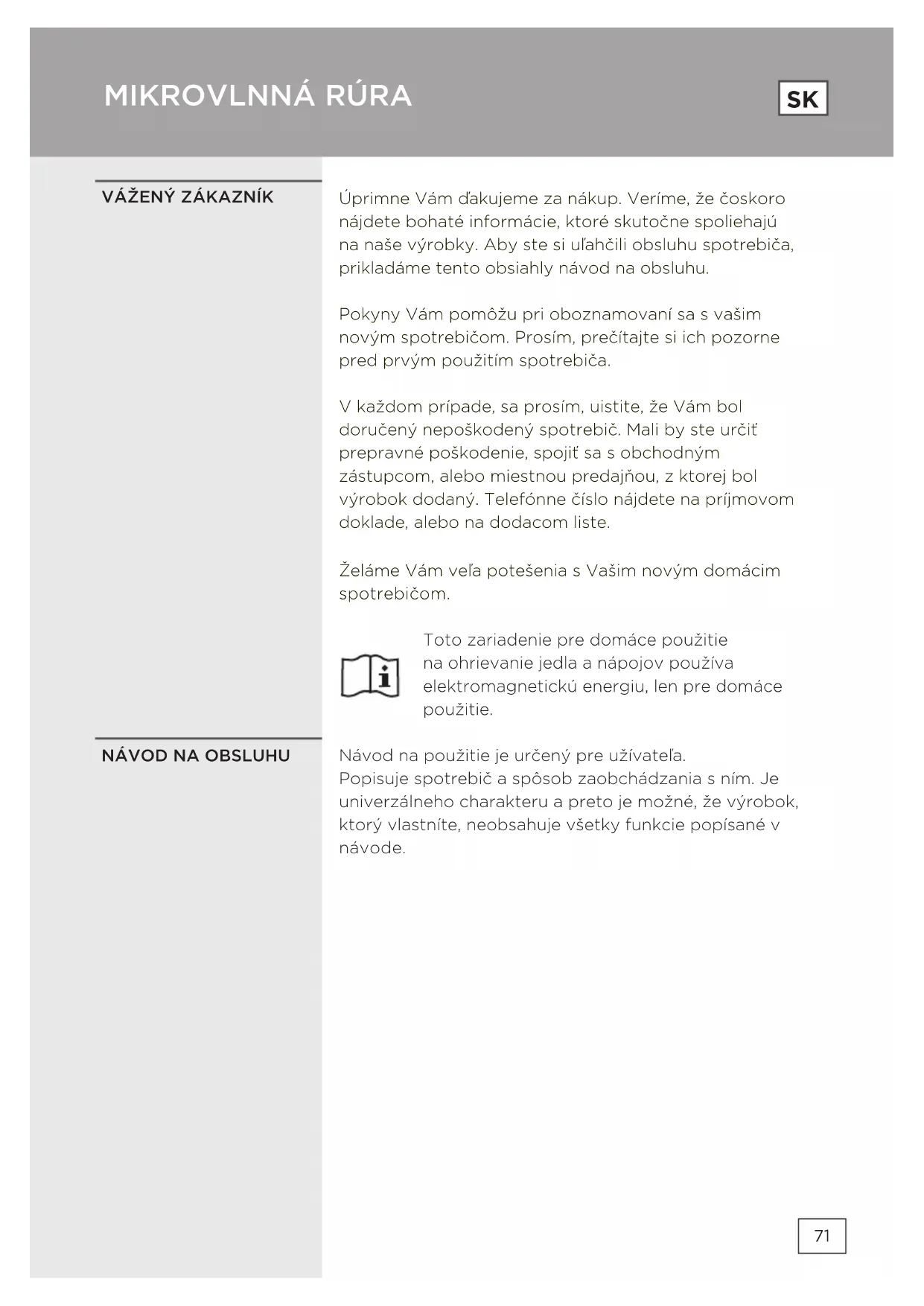Úprimne Vám ďakujeme za nákup. Veríme, že čoskoro nájdete bohaté informácie, ktoré skutočne spoliehajú na naše výrobky. Aby ste si uľahčili obsluhu spotrebiča, prikladáme tento obsiahly návod na obsluhu. Pokyny Vám pomôžu pri oboznamovaní sa s vašim novým spotrebičom. Prosím, prečítajte si ich pozorne pred prvým použitím spotrebiča. V každom prípade, sa prosím, uistite, že Vám bol doručený nepoškodený spotrebič. Mali by ste určiť prepravné poškodenie, spojiť sa s obchodným zástupcom, alebo miestnou predajňou, z ktorej bol výrobok dodaný. Telefónne číslo nájdete na príjmovom doklade, alebo na dodacom liste. Želáme Vám veľa potešenia s Vašim novým domácim spotrebičom. Toto zariadenie pre domáce použitie na ohrievanie jedla a nápojov používa elektromagnetickú energiu, len pre domáce použitie. Návod na použitie je určený pre užívateľa. Popisuje spotrebič a spôsob zaobchádzania s ním. Je univerzálneho charakteru a preto je možné, že výrobok, ktorý vlastníte, neobsahuje všetky funkcie popísané v návode.