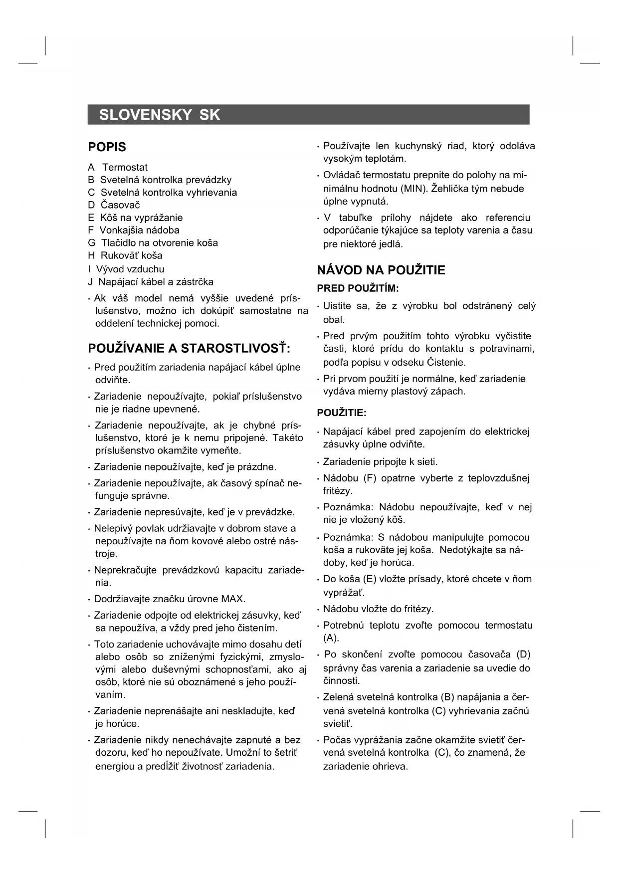 nefunguje. Zariadenie nie je zapojené do elektrickej zásuvky. Sieťovú zástrčku zapojte do uzemnenej nástennej elektrickej zásuvky. Nenastavili ste časovač. Zariadenie zapnite otočením otočného ovládača časovača na požadovaný čas varenia. Jedlá vyprážané v TEPLOVZDUŠNEJ FRITÉZE sú nedopečené. V koši je veľmi veľké množstvo jedla. Do koša vkladajte menšie dávky jedla. Menšie dávky sa rovnomernejšie vypražia. Nastavená je veľmi nízka teplota. Otočný ovládač teploty otočte na požadovanú teplotu. Nastavenie teploty - na porovnanie si pozrite sprievodcu varením. Jedlo je v TEPLOVZDUŠNEJ FRITÉZE nerovnomerne vypražené. Niektoré typy jedál sa musia v polovici času varenia dôkladne premiešať. Jedlo, ktoré je na vrchu alebo naukladané cez seba (napr, hranolky), sa musí v polovici času varenia dôkladne premiešať. Vyprážané nugetky nie sú chrumkavé pri ich vyberaní z TEPLOVZDUŠNEJ FRITÉZY. Použitý nesprávny typ jedla. Pozrite si pokyny na varenie od výrobcov jedál. Panvica alebo kôš sa mi nedá zasunúť do zariadenia. Kôš je preplnený. Kôš nenapĺňajte nad značku MAX. Kôš je do panvice nesprávne vložený. Kôš vložte do panvice, až kým nebudete počuť kliknutie. Zo zariadenia vychádza biely dym. Vložené bolo jedlo s vysokým obsahom oleja. Do jedla bol pridaný olej. Nepoužívajte skupiny jedál s vysokým obsahom oleja ani nepridávajte ďalší olej, keď to nie je potrebné. Táto teplovzdušná fritéza využíva technológiu, pri ktorej je potrebné malé alebo žiadne množstvo oleja. V panvici sa stále nachádzajú zvyšky tuku z predchádzajúceho používania. Pri zohrievaní tuku v panvici vzniká biely dym. Pred každým použitím nezabudnite dôkladne vyčistiť panvicu.MAGYAR HU