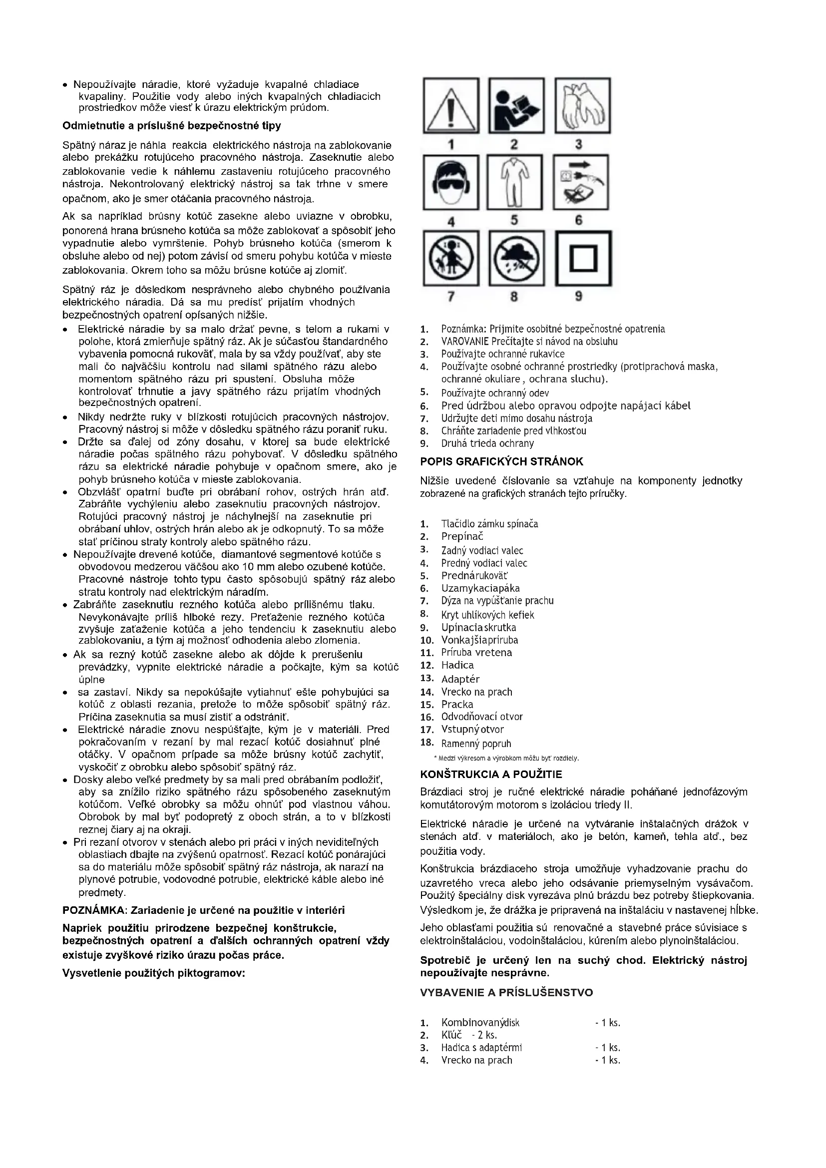 - Musia sa používať osobné ochranné prostriedky. V závislosti od typu práce noste ochrannú masku pokrývajúcu celú tvár, ochranu očí alebo ochranné okuliare. V prípade potreby použite protiprachovú masku, ochranu sluchu, ochranné rukavice alebo špeciálnu zásteru na ochranu pred malými čiastočkami obrusovaného a obrábaného materiálu. Chráňte si oči pred cudzími telesami vo vzduchu, ktoré vznikajú pri práci. Prachová maska a ochrana dýchacích ciest musia odfiltrovať prach vznikajúci počas práce. Dlhodobé vystavenie hluku môže viesť k strate sluchu.