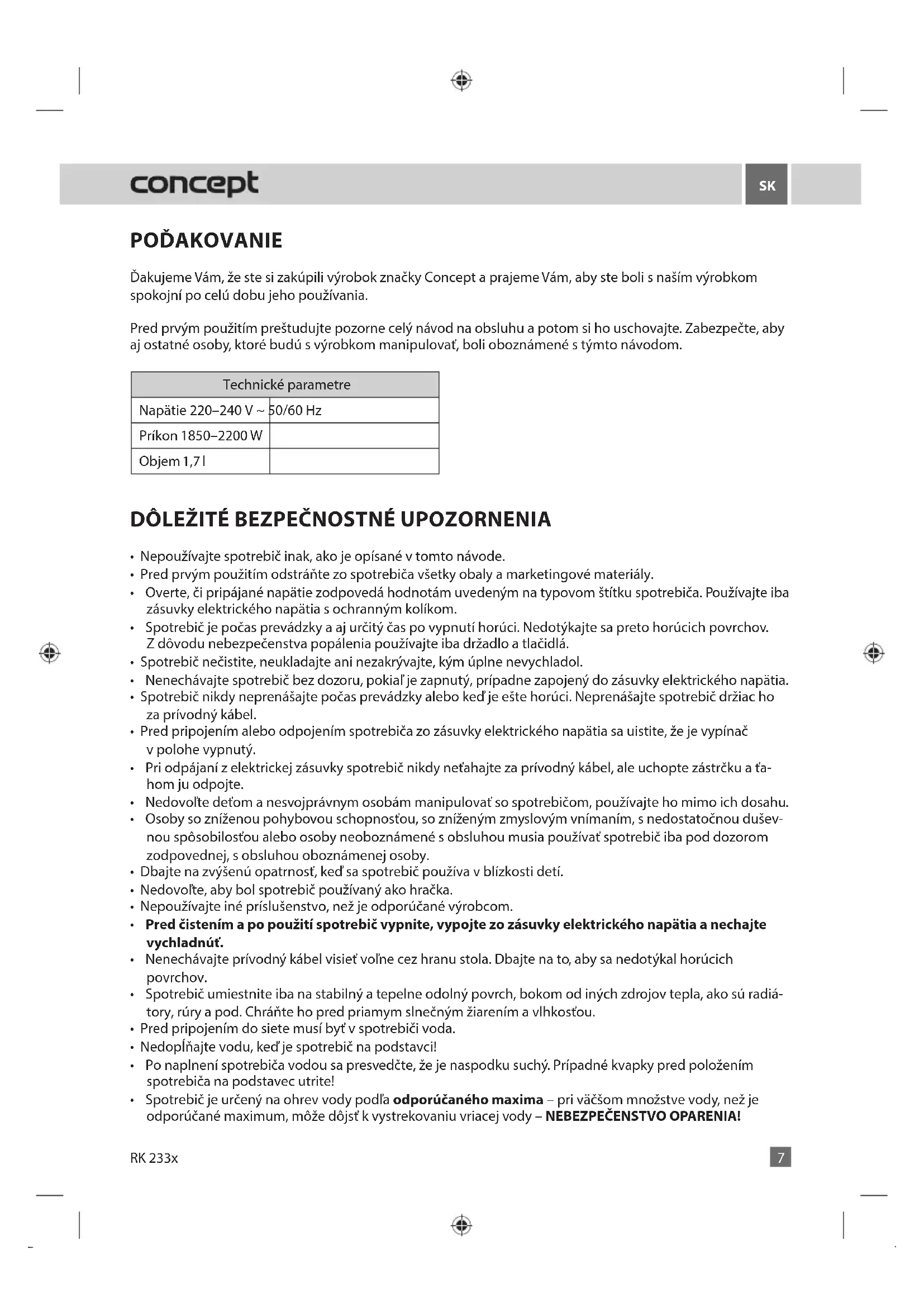 POĎAKOVANIE Ďakujeme Vám, že ste si zakúpili výrobok značky Concept a prajeme Vám, aby ste boli s naším výrobkom spokojní po celú dobu jeho používania. Pred prvým použitím preštudujte pozorne celý návod na obsluhu a potom si ho uschovajte. Zabezpečte, aby aj ostatné osoby, ktoré budú s výrobkom manipulovať, boli oboznámené s týmto návodom. Technické parametre Napätie 220–240 V ~ 50/60 Hz Príkon 1850–2200 W Objem 1,7 l
