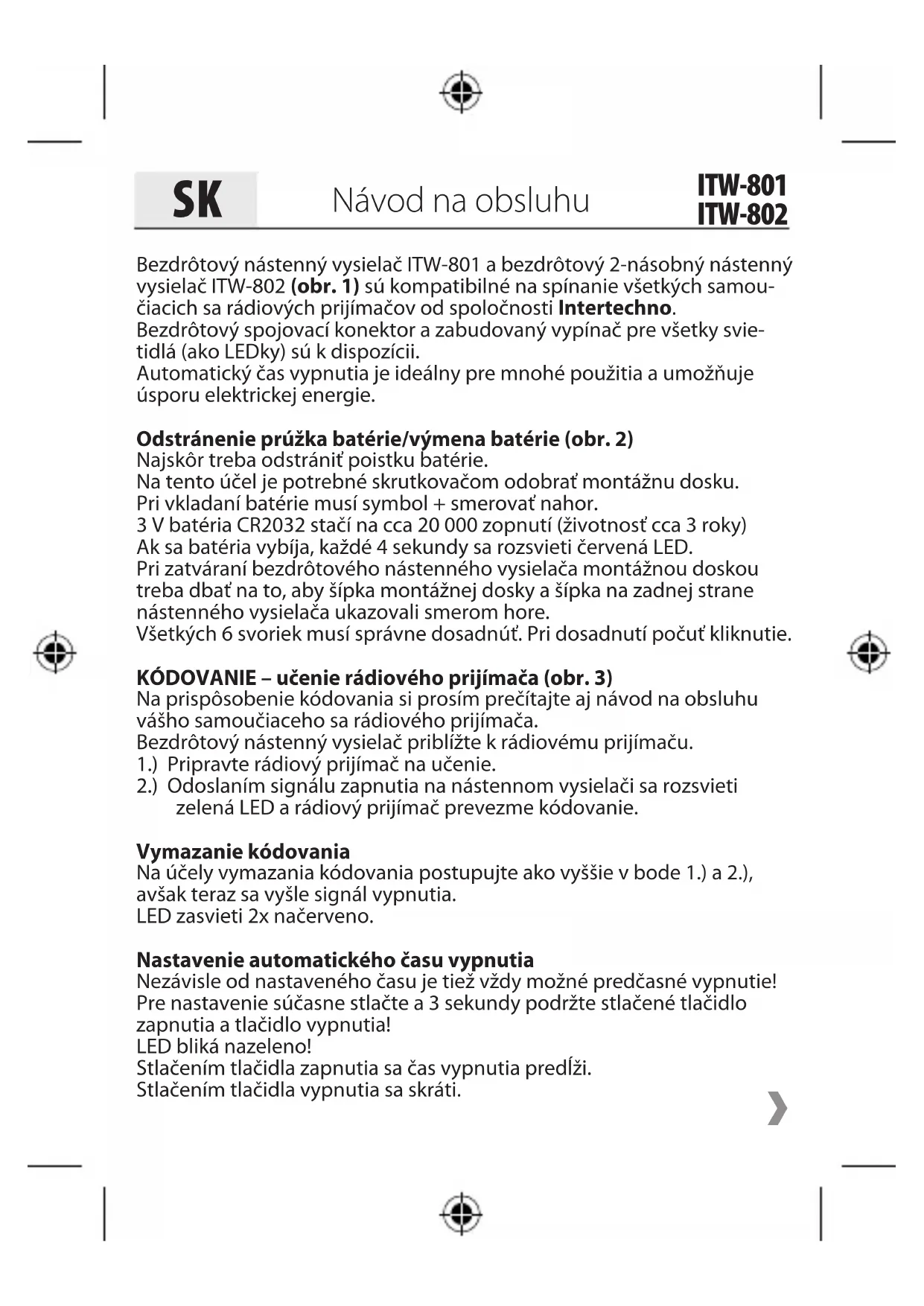 ITW-801 ITW-802Bezdrôtový nástenný vysielač ITW-801 a bezdrôtový 2-násobný nástenný vysielač ITW-802 (obr. 1) sú kompatibilné na spínanie všetkých samou- čiacich sa rádiových prijímačov od spoločnosti Intertechno. Bezdrôtový spojovací konektor a zabudovaný vypínač pre všetky svie- tidlá (ako LEDky) sú k dispozícii. Automatický čas vypnutia je ideálny pre mnohé použitia a umožňuje úsporu elektrickej energie. Odstránenie prúžka batérie/výmena batérie (obr. 2) Najskôr treba odstrániť poistku batérie. Na tento účel je potrebné skrutkovačom odobrať montážnu dosku. Pri vkladaní batérie musí symbol + smerovať nahor. 3 V batéria CR2032 stačí na cca 20 000 zopnutí (životnosť cca 3 roky) Ak sa batéria vybíja, každé 4 sekundy sa rozsvieti červená LED. Pri zatváraní bezdrôtového nástenného vysielača montážnou doskou treba dbať na to, aby šípka montážnej dosky a šípka na zadnej strane nástenného vysielača ukazovali smerom hore. Všetkých 6 svoriek musí správne dosadnúť. Pri dosadnutí počuť kliknutie. KÓDOVANIE – učenie rádiového prijímača (obr. 3) Na prispôsobenie kódovania si prosím prečítajte aj návod na obsluhu vášho samoučiaceho sa rádiového prijímača. Bezdrôtový nástenný vysielač priblížte k rádiovému prijímaču. 1.) Pripravte rádiový prijímač na učenie. 2.) Odoslaním signálu zapnutia na nástennom vysielači sa rozsvieti zelená LED a rádiový prijímač prevezme kódovanie. Vymazanie kódovania Na účely vymazania kódovania postupujte ako vyššie v bode 1.) a 2.), avšak teraz sa vyšle signál vypnutia. LED zasvieti 2x načerveno. Nastavenie automatického času vypnutia Nezávisle od nastaveného času je tiež vždy možné predčasné vypnutie! Pre nastavenie súčasne stlačte a 3 sekundy podržte stlačené tlačidlo zapnutia a tlačidlo vypnutia! LED bliká nazeleno! Stlačením tlačidla zapnutia sa čas vypnutia predĺži. Stlačením tlačidla vypnutia sa skráti. Návod na obsluhu