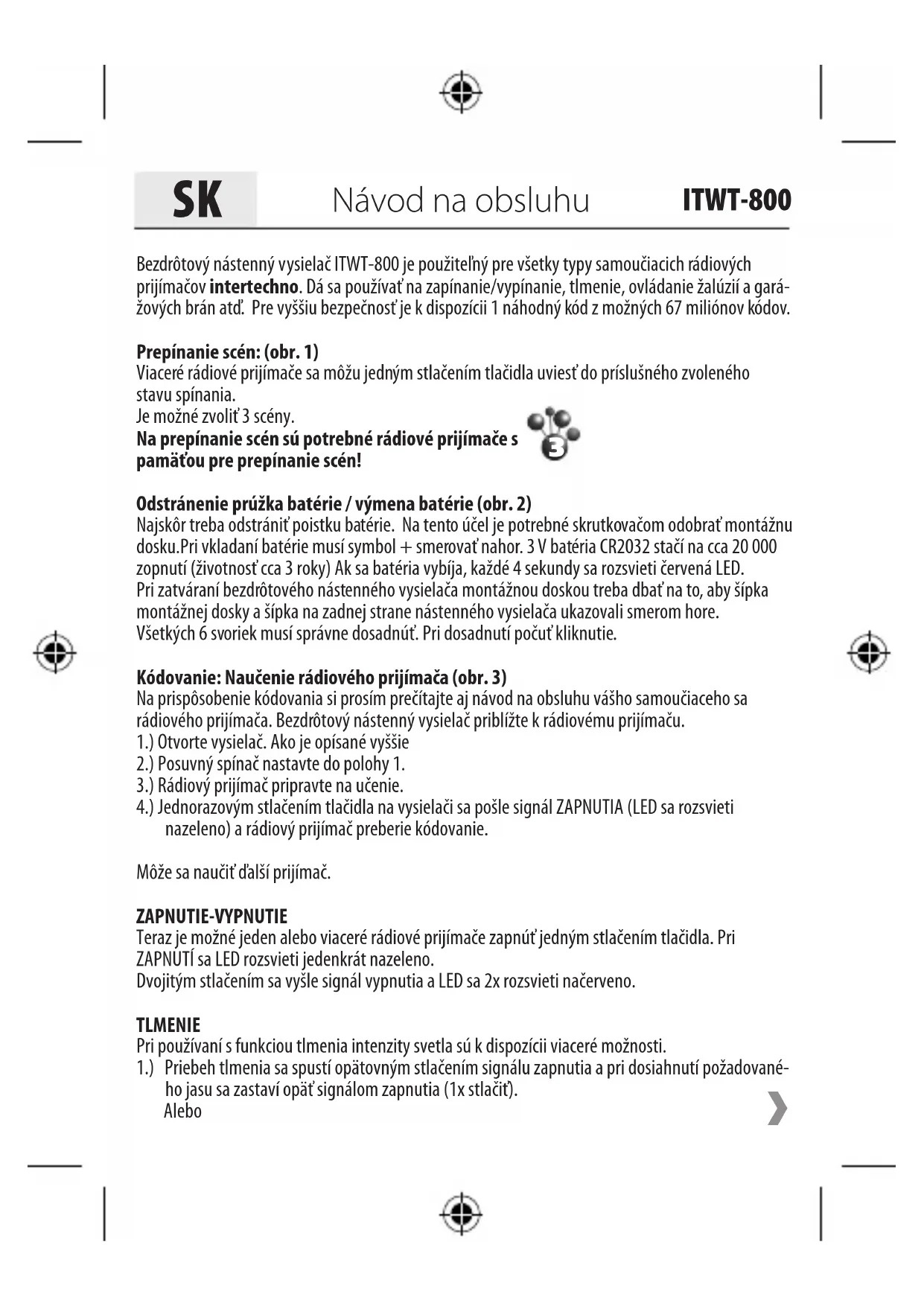 ITWT-800Bezdrôtový nástenný vysielač ITWT-800 je použiteľný pre všetky typy samoučiacich rádiových prijímačov intertechno. Dá sa používať na zapínanie/vypínanie, tlmenie, ovládanie žalúzií a gará- žových brán atď. Pre vyššiu bezpečnosť je k dispozícii 1 náhodný kód z možných 67 miliónov kódov. Prepínanie scén: (obr. 1) Viaceré rádiové prijímače sa môžu jedným stlačením tlačidla uviesť do príslušného zvoleného stavu spínania.Je možné zvoliť 3 scény. Na prepínanie scén sú potrebné rádiové prijímače s pamäťou pre prepínanie scén! Odstránenie prúžka batérie / výmena batérie (obr. 2) Najskôr treba odstrániť poistku batérie. Na tento účel je potrebné skrutkovačom odobrať montážnu dosku.Pri vkladaní batérie musí symbol + smerovať nahor. 3 V batéria CR2032 stačí na cca 20 000 zopnutí (životnosť cca 3 roky) Ak sa batéria vybíja, každé 4 sekundy sa rozsvieti červená LED. Pri zatváraní bezdrôtového nástenného vysielača montážnou doskou treba dbať na to, aby šípka montážnej dosky a šípka na zadnej strane nástenného vysielača ukazovali smerom hore. Všetkých 6 svoriek musí správne dosadnúť. Pri dosadnutí počuť kliknutie. Kódovanie: Naučenie rádiového prijímača (obr. 3)Na prispôsobenie kódovania si prosím prečítajte aj návod na obsluhu vášho samoučiaceho sa rádiového prijímača. Bezdrôtový nástenný vysielač priblížte k rádiovému prijímaču. 1.) Otvorte vysielač. Ako je opísané vyššie 2.) Posuvný spínač nastavte do polohy 1.3.) Rádiový prijímač pripravte na učenie.4.) Jednorazovým stlačením tlačidla na vysielači sa pošle signál ZAPNUTIA (LED sa rozsvieti nazeleno) a rádiový prijímač preberie kódovanie.Môže sa naučiť ďalší prijímač.ZAPNUTIE-VYPNUTIETeraz je možné jeden alebo viaceré rádiové prijímače zapnúť jedným stlačením tlačidla. Pri ZAPNUTÍ sa LED rozsvieti jedenkrát nazeleno. Dvojitým stlačením sa vyšle signál vypnutia a LED sa 2x rozsvieti načerveno.TLMENIEPri používaní s funkciou tlmenia intenzity svetla sú k dispozícii viaceré možnosti. 1.) Priebeh tlmenia sa spustí opätovným stlačením signálu zapnutia a pri dosiahnutí požadované-ho jasu sa zastaví opäť signálom zapnutia (1x stlačiť). Alebo Návod na obsluhu