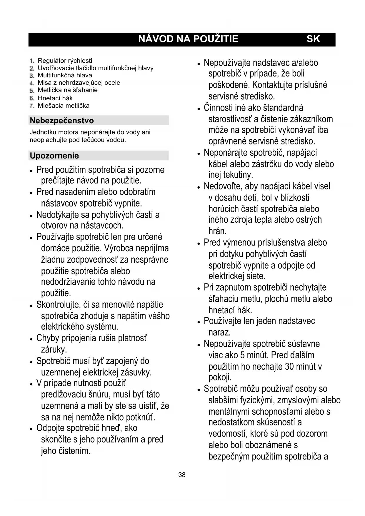 Regulátor rýchlosti Uvoľňovacie tlačidlo multifunkčnej hlavy Multifunkčná hlava Misa z nehrdzavejúcej ocele Metlička na šľahanie Hnetací hák Miešacia metlička Nebezpečenstvo Jednotku motora neponárajte do vody ani neoplachujte pod tečúcou vodou. Upozornenie