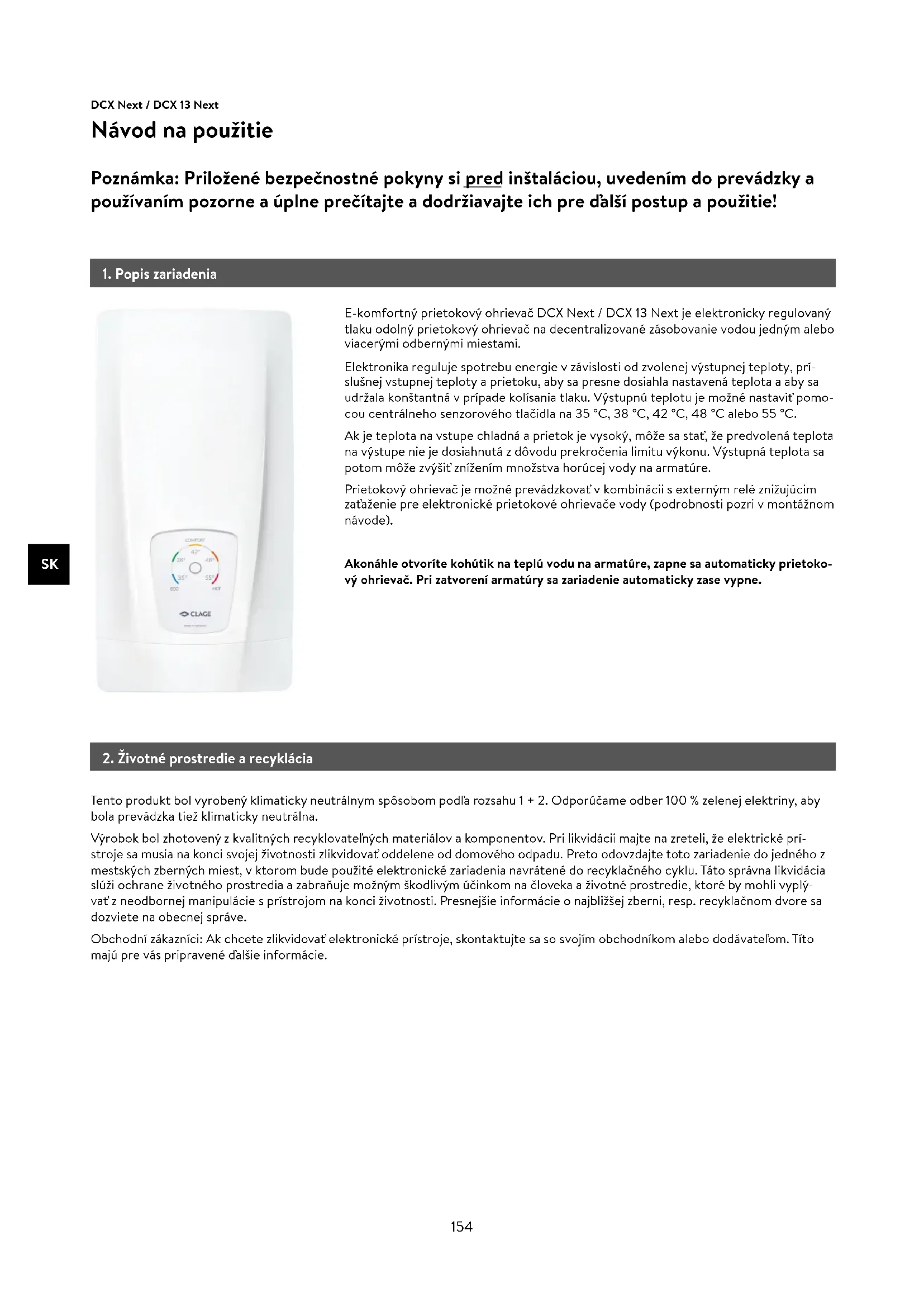 E-komfortný prietokový ohrievač DCX Next / DCX 13 Next je elektronicky regulovaný tlaku odolný prietokový ohrievač na decentralizované zásobovanie vodou jedným alebo viacerými odbernými miestami. Elektronika reguluje spotrebu energie v závislosti od zvolenej výstupnej teploty, prí- slušnej vstupnej teploty a prietoku, aby sa presne dosiahla nastavená teplota a aby sa udržala konštantná v prípade kolísania tlaku. Výstupnú teplotu je možné nastaviť pomo- cou centrálneho senzorového tlačidla na 35 °C, 38 °C, 42 °C, 48 °C alebo 55 °C. Ak je teplota na vstupe chladná a prietok je vysoký, môže sa stať, že predvolená teplota na výstupe nie je dosiahnutá z dôvodu prekročenia limitu výkonu. Výstupná teplota sa potom môže zvýšiť znížením množstva horúcej vody na armatúre. Prietokový ohrievač je možné prevádzkovať v kombinácii s externým relé znižujúcim zaťaženie pre elektronické prietokové ohrievače vody (podrobnosti pozri v montážnom návode).
