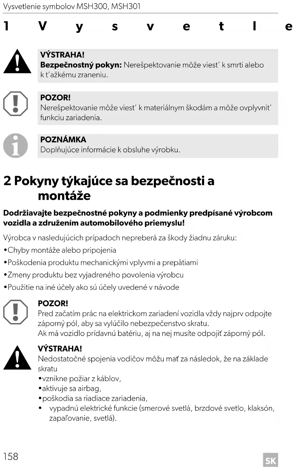 - vypadnú elektrické funkcie (smerové svetlá, brzdové svetlo, klaksón, zapaľovanie, svetlá). VÝSTRAHA! Bezpečnostný pokyn: Nerešpektovanie môže viest’ k smrti alebo k t’ažkému zraneniu. POZOR! Nerešpektovanie môže viest’ k materiálnym škodám a môže ovplyvnit’ funkciu zariadenia. POZNÁMKA Doplňujúce informácie k obsluhe výrobku. MSH300--IO-16s.book Seite 158 Donnerstag, 13. Juli 2017 10:28 10SK MSH300, MSH301 Pokyny týkajúce sa bezpečnosti a montáže