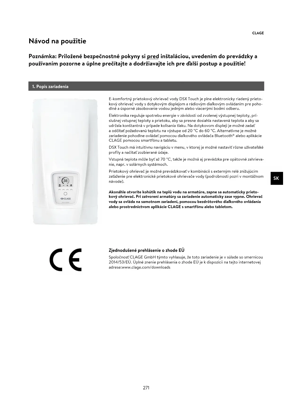 alebo aplikácie CLAGE pomocou smartfónu a tabletu. DSX Touch má intuitívnu navigáciu v menu, v ktorej je možné nastaviť rôzne užívateľské profily a načítať zozbierané údaje. Vstupná teplota môže byť až 70 °C, takže je možná aj prevádzka pre opätovné zahrieva- nie, napr. v solárnych systémoch. Prietokový ohrievač je možné prevádzkovať v kombinácii s externým relé znižujúcim zaťaženie pre elektronické prietokové ohrievače vody (podrobnosti pozri v montážnom návode). Poznámka: Priložené bezpečnostné pokyny si pred inštaláciou, uvedením do prevádzky a používaním pozorne a úplne prečítajte a dodržiavajte ich pre ďalší postup a použitie! Návod na použitie Zjednodušené prehlásenie o zhode EÚ Spoločnosť CLAGE GmbH týmto vyhlasuje, že toto zariadenie je v súlade so smernicou 2014/53/EÚ. Úplné znenie prehlásenia o zhode EÚ je k dispozícii na tejto internetovej adrese: www.clage.com/downloads272