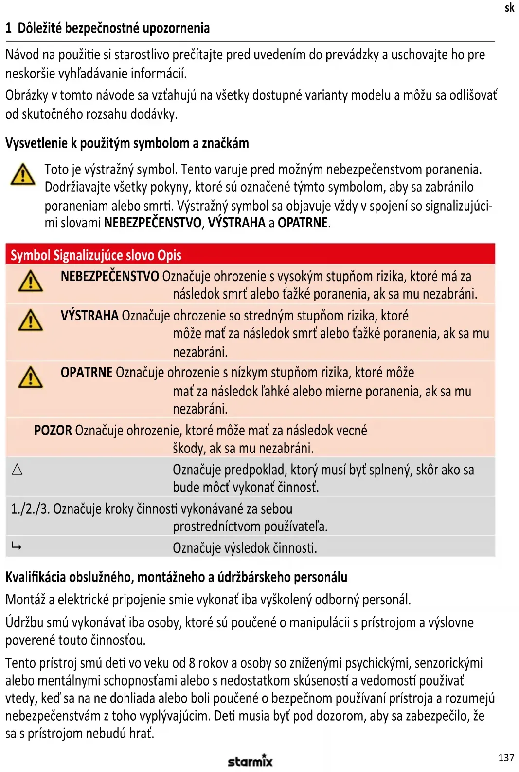 Označuje výsledok činnos. Kvalikácia obslužného, montážneho a údržbárskeho personálu Montáž a elektrické pripojenie smie vykonať iba vyškolený odborný personál. Údržbu smú vykonávať iba osoby, ktoré sú poučené o manipulácii s prístrojom a výslovne poverené touto činnosťou. Tento prístroj smú de vo veku od 8 rokov a osoby so zníženými psychickými, senzorickými alebo mentálnymi schopnosťami alebo s nedostatkom skúsenos a vedomos používať vtedy, keď sa na ne dohliada alebo boli poučené o bezpečnom používaní prístroja a rozumejú nebezpečenstvám z toho vyplývajúcim. De musia byť pod dozorom, aby sa zabezpečilo, že sa s prístrojom nebudú hrať.138