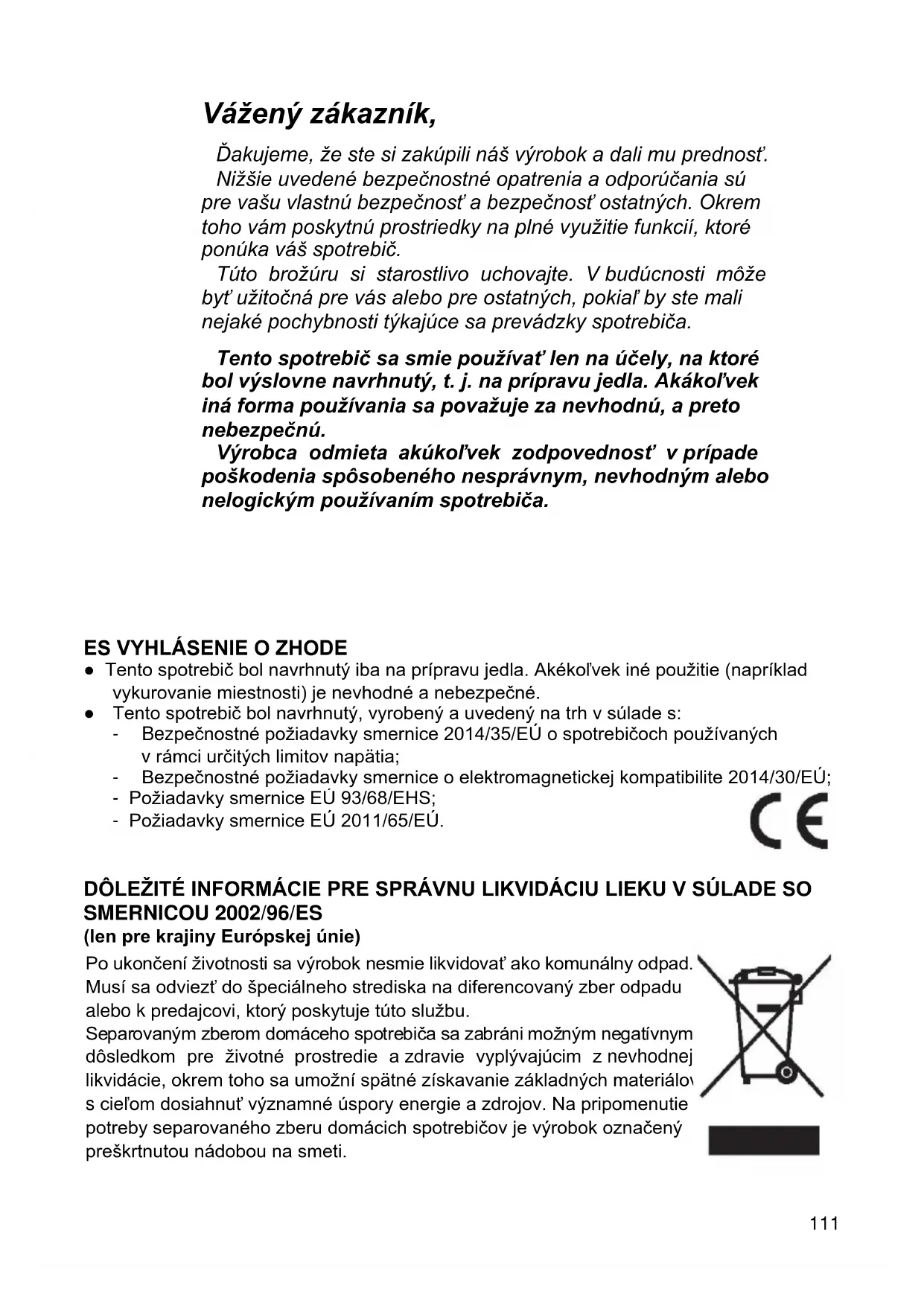 Vážený zákazník, Ďakujeme, že ste si zakúpili náš výrobok a dali mu prednosť. Nižšie uvedené bezpečnostné opatrenia a odporúčania sú pre vašu vlastnú bezpečnosť a bezpečnosť ostatných. Okrem toho vám poskytnú prostriedky na plné využitie funkcií, ktoré ponúka váš spotrebič. Túto brožúru si starostlivo uchovajte. V budúcnosti môže byť užitočná pre vás alebo pre ostatných, pokiaľ by ste mali nejaké pochybnosti týkajúce sa prevádzky spotrebiča. Tento spotrebič sa smie používať len na účely, na ktoré bol výslovne navrhnutý, t. j. na prípravu jedla. Akákoľvek iná forma používania sa považuje za nevhodnú, a preto nebezpečnú. Výrobca odmieta akúkoľvek zodpovednosť v prípade poškodenia spôsobeného nesprávnym, nevhodným alebo nelogickým používaním spotrebiča.