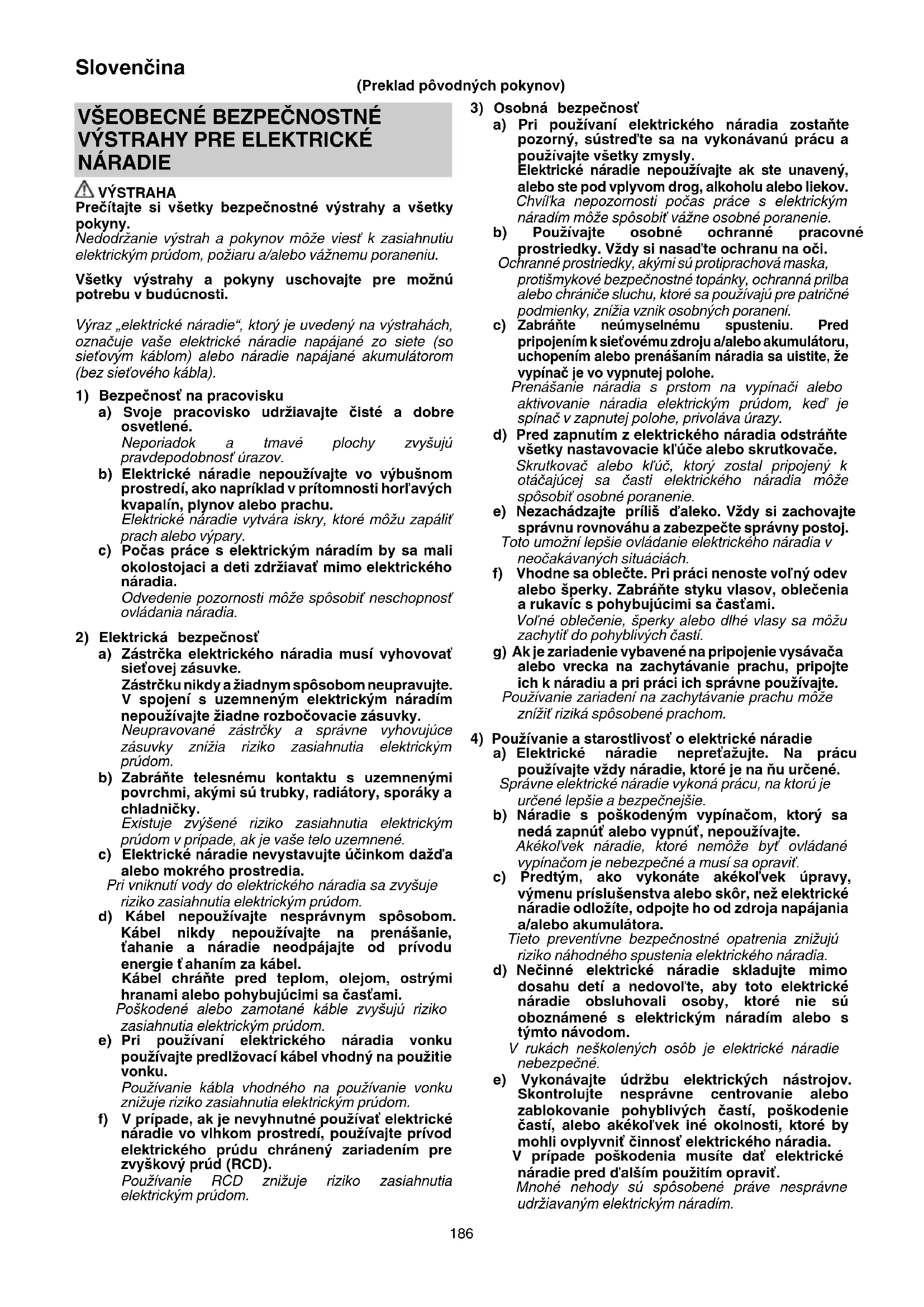 NÁRADIE VÝSTRAHA Prečítajte si všetky bezpečnostné výstrahy a všetky pokyny. Nedodržanie výstrah a pokynov môže viesť k zasiahnutiu elektrickým prúdom, požiaru a/alebo vážnemu poraneniu. Všetky výstrahy a pokyny uschovajte pre možnú potrebu v budúcnosti. Výraz „elektrické náradie“, ktorý je uvedený na výstrahách, označuje vaše elektrické náradie napájané zo siete (so sieťovým káblom) alebo náradie napájané akumulátorom (bez sieťového kábla).