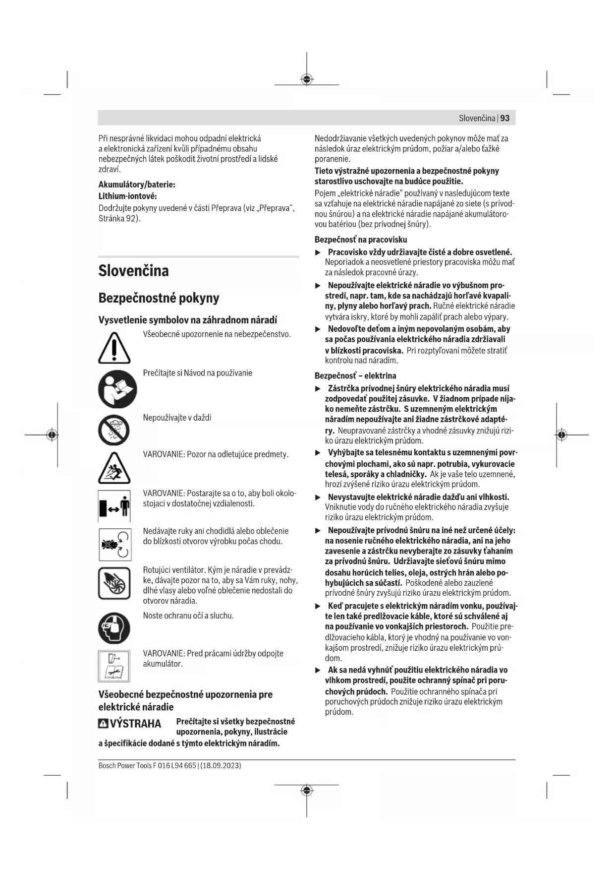 Symboly Následující symboly mají význam pro čtení a pochopení návodu k obsluze. Zapamatujte si symboly a jejich význam. Správná interpretace symbolů Vám pomůže výrobek lépe a bezpečněji používat. Symbol Význam Směr pohybu Zapnutí Zapnutí Vypnutí CLICK! Slyšitelný zvuk Příslušenství Hledání závad Následující tabulka ukazuje příznaky závad a jak můžete učinit nápravu, pokud Váš stroj někdy nepracuje dobře. Pokud s ní nemůžete problém lokalizovat a odstranit, obraťte se na Váš servis. Pozor: Před hledáním chyb stroj vypněte. Pozor: V případě úrazu nebo porušení nástroje stroj ihned zastavte a odstraňte akumulátor. Příznak Možná příčina Odstranění Zahradní nářadí neběží Vybitý akumulátor Nabijte akumulátor Bosch Power Tools F 016 L94 665 | (18.09.2023)92 | Čeština Příznak Možná příčina Odstranění Akumulátor není správně nasazený Akumulátor správně nasaďte (viz obrázek C) Příliš studený/horký akumulátor Akumulátor nechte ohřát/ochladit Výrobek startujte vždy s nižším počtem otáček Vadné zahradní nářadí Vyhledejte servis Zahradní nářadí běží přerušovaně Vadný spínač Vyhledejte servis Vadný regulátor rychlosti vzduchového proudu Vyhledejte servis Silné vibrace/hluk Vadné zahradní nářadí Vyhledejte servis Příliš krátká doba práce na jedno nabití akumulátoru Akumulátor nebyl delší dobu používán nebo pouze krátkodobě Akumulátor zcela nabijte Akumulátor je zničený nebo vadný Akumulátor nahraďte Zahradní nářadí fouká Zablokovaná hubice Hubici uvolněte Omezený proud vzduchu Zablokovaný přívod vzduchu Přívod vzduchu uvolněte Příliš studený akumulátor Výrobek startujte vždy s nižším počtem otáček Hubici nelze namontovat Nesprávná montáž Hubici namontujte správně (viz obrázek B) Údržba a servis Údržba, čištění a skladování u Nechte výrobky opravit pouze kvalifikovanými odbornými pracovníky apouze za použití originálních náhradních dílů. Tím bude zajištěno, že zůstane zachovaná bezpečnost. u Nikdy neprovádějte servis poškozených akumulátorů. Servis akumulátorů by měl provádět pouze výrobce nebo autorizovaná opravna. Údržba, čištění a skladování Před uskladněním výrobek očistěte hadříkem. Při čištění a namontování hubice dbejte na to, aby byl motor vypnutý a akumulátor odpojený. Nikdy nepoužívejte rozpouštědla. Nikdy nekropte výrobek vodou. Nikdy neponořujte výrobek pod vodu. Zákaznická služba aporadenství ohledně použití Zákaznická služba zodpoví vaše dotazy kopravě aúdržbě vašeho výrobku atéž knáhradním dílům. Rozkladové výkresy ainformace onáhradních dílech najdete také na: www.bosch-pt.com Vpřípadě dotazů knašim výrobkům apříslušenství vám ochotně pomůže poradenský tým Bosch. Vpřípadě veškerých otázek aobjednávek náhradních dílů bezpodmínečně uveďte 10místné věcné číslo podle typového štítku výrobku. Czech Republic Robert Bosch odbytová s.r.o. Bosch Service Center PT K Vápence 1621/16 692 01 Mikulov Na www.bosch-pt.cz si si můžete objednat opravu Vašeho stroje nebo náhradní díly online. Tel.: +420 519 305700 Fax: +420 519 305705 E-Mail: servis.naradi@cz.bosch.com www.bosch-pt.cz Další adresy servisů najdete na: www.bosch-pt.com/serviceaddresses Přeprava Doporučené lithium-iontové akumulátory podléhají požadavkům zákona onebezpečných nákladech. Tyto akumulátory mohou být bez dalších podmínek přepravovány uživatelem po silnici. Při zasílání prostřednictvím třetí osoby (např.: letecká přeprava nebo spedice) je třeba brát zřetel na zvláštní požadavky na balení aoznačení. Zde musí být při přípravě zásilky nezbytně přizván expert na nebezpečné náklady. Akumulátory zasílejte pouze tehdy, pokud není poškozený kryt. Otevřené kontakty přelepte lepicí páskou aakumulátor zabalte tak, aby se vobalu nemohl pohybovat. Dodržujte také případné další národní předpisy. Likvidace Výrobky, akumulátory, příslušenství a obaly mají být dodány k opětovnému zhodnocení nepoškozujícímu životní prostředí. Výrobky aakumulátory/baterie nevyhazujte do domovního odpadu! Pouze pro zeměEU: Podle evropské směrnice 2012/19/EU musejí být neupotřebitelné výrobky a podle evropské směrnice 2006/66/ES vadné nebo opotřebované akumulátory/ baterie odděleně shromážděny a dodány k opětovnému zhodnocení nepoškozujícímu životní prostředí. F 016 L94 665 | (18.09.2023) Bosch Power ToolsSlovenčina | 93 Při nesprávné likvidaci mohou odpadní elektrická aelektronická zařízení kvůli případnému obsahu nebezpečných látek poškodit životní prostředí alidské zdraví. Akumulátory/baterie: Lithium-iontové: Dodržujte pokyny uvedené včásti Přeprava (viz „Přeprava“, Stránka92). Slovenčina Bezpečnostné pokyny Vysvetlenie symbolov na záhradnom náradí Všeobecné upozornenie na nebezpečenstvo. Prečítajte si Návod na používanie Nepoužívajte v daždi VAROVANIE: Pozor na odletujúce predmety. VAROVANIE: Postarajte sa o to, aby boli okolo- stojaci v dostatočnej vzdialenosti. Nedávajte ruky ani chodidlá alebo oblečenie do blízkosti otvorov výrobku počas chodu. Rotujúci ventilátor. Kým je náradie v prevádz- ke, dávajte pozor na to, aby sa Vám ruky, nohy, dlhé vlasy alebo voľné oblečenie nedostali do otvorov náradia. Noste ochranu očí asluchu. VAROVANIE: Pred prácami údržby odpojte akumulátor. Všeobecné bezpečnostné upozornenia pre elektrické náradie VÝSTRAHA Prečítajte si všetky bezpečnostné upozornenia, pokyny, ilustrácie ašpecifikácie dodané stýmto elektrickým náradím. Nedodržiavanie všetkých uvedených pokynov môže mať za následok úraz elektrickým prúdom, požiar a/alebo ťažké 