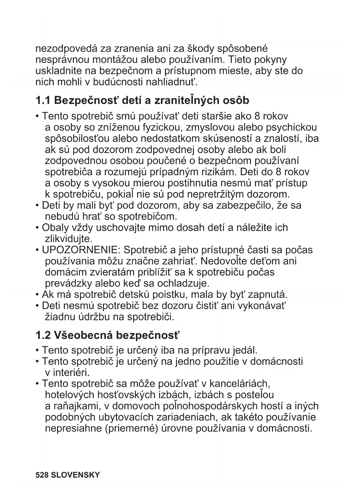 - Tento spotrebič smú používať deti staršie ako 8 rokov a osoby so zníženou fyzickou, zmyslovou alebo psychickou spôsobilosťou alebo nedostatkom skúseností a znalostí, iba ak sú pod dozorom zodpovednej osoby alebo ak boli zodpovednou osobou poučené o bezpečnom používaní spotrebiča a rozumejú prípadným rizikám. Deti do 8 rokov a osoby s vysokou mierou postihnutia nesmú mať prístup k spotrebiču, pokiaľ nie sú pod nepretržitým dozorom.