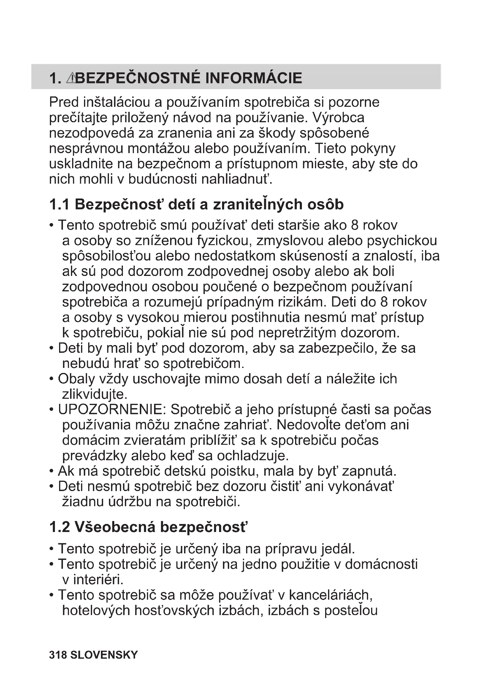 - Tento spotrebič smú používať deti staršie ako 8 rokov a osoby so zníženou fyzickou, zmyslovou alebo psychickou spôsobilosťou alebo nedostatkom skúseností a znalostí, iba ak sú pod dozorom zodpovednej osoby alebo ak boli zodpovednou osobou poučené o bezpečnom používaní spotrebiča a rozumejú prípadným rizikám. Deti do 8 rokov a osoby s vysokou mierou postihnutia nesmú mať prístup k spotrebiču, pokiaľ nie sú pod nepretržitým dozorom.