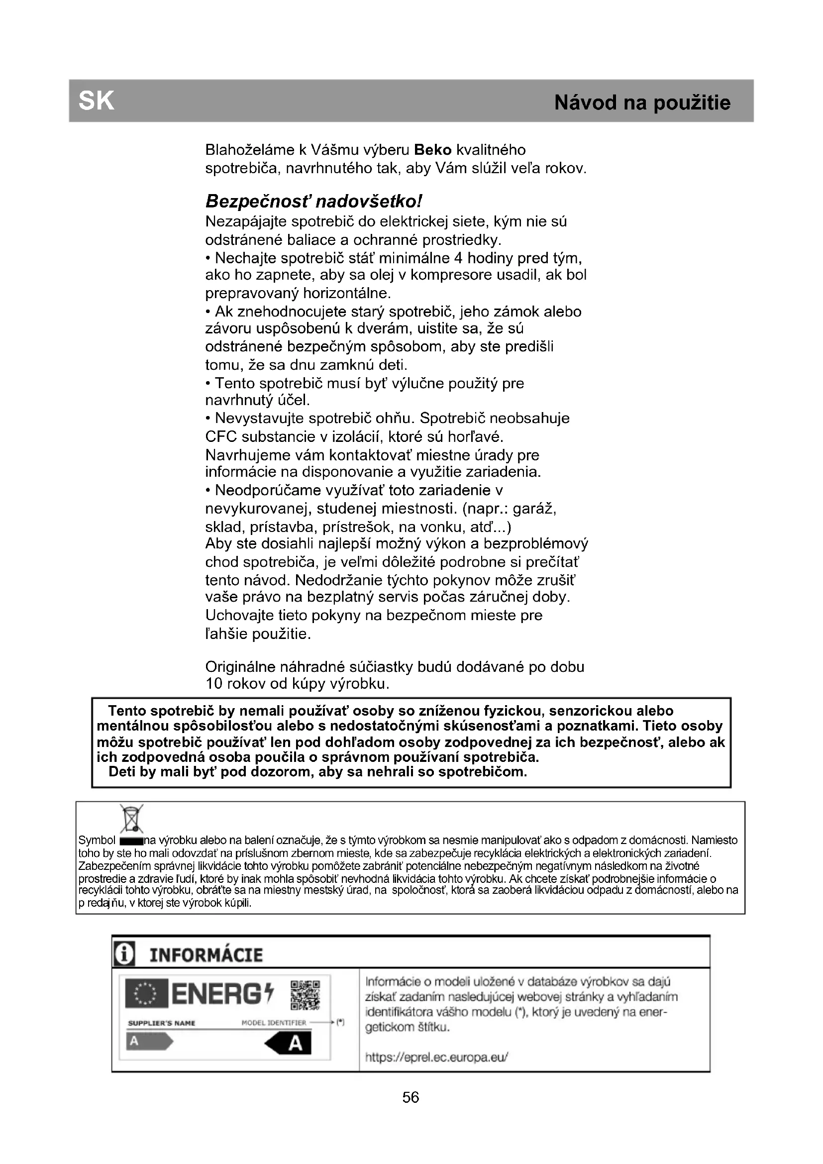 Tento spotrebič by nemali používať osoby so zníženou fyzickou, senzorickou alebo mentálnou spôsobilosťou alebo s nedostatočnými skúsenosťami a poznatkami. Tieto osoby môžu spotrebič používať len pod dohľadom osoby zodpovednej za ich bezpečnosť, alebo ak ich zodpovedná osoba poučila o správnom používaní spotrebiča. Deti by mali byť pod dozorom, aby sa nehrali so spotrebičom.