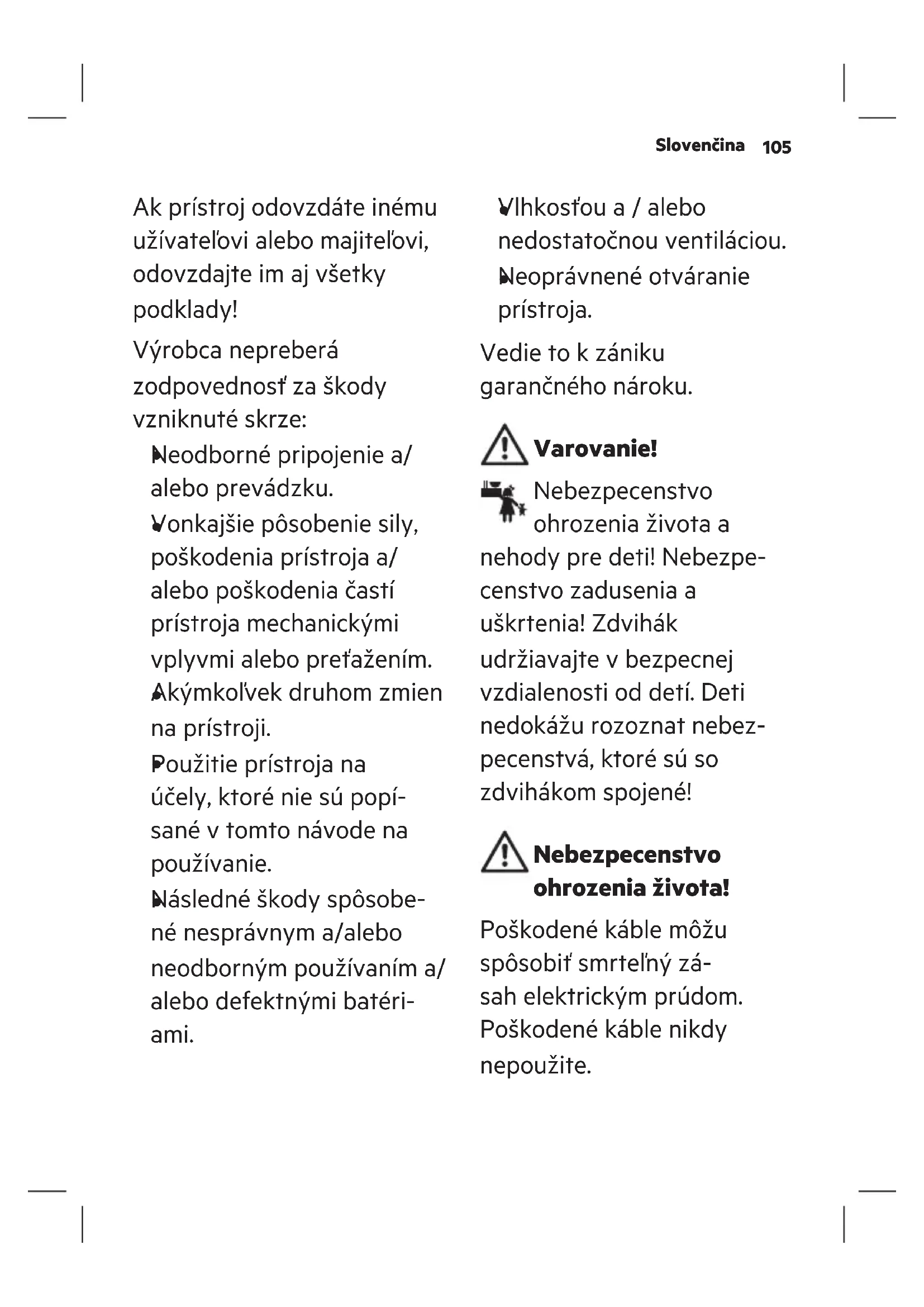 Nepoužívajte poškodené zariadenie. Poškodenie zvyšuje riziko úrazu elekt- rickým prúdom. Nebezpecenstvo požiaru!