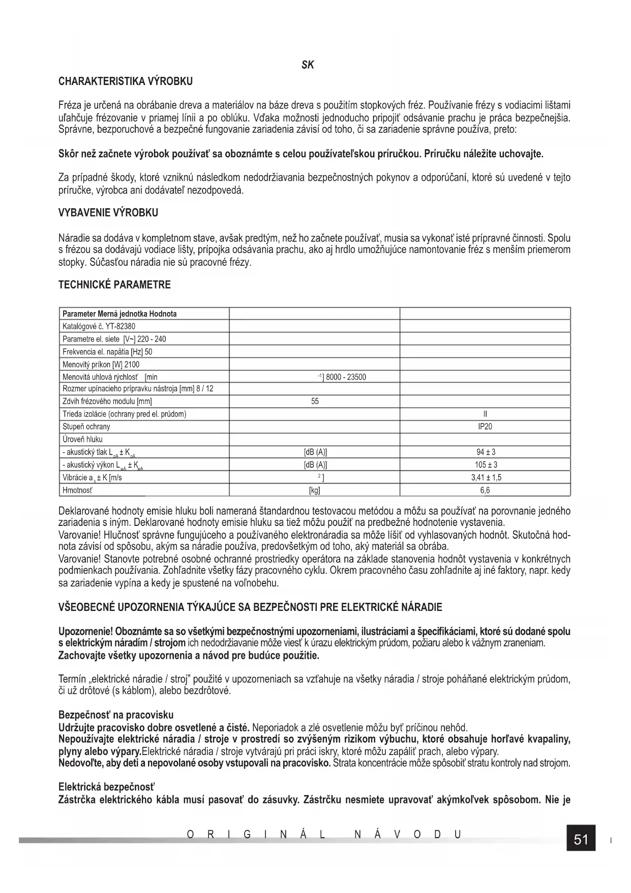 Náradie sa dodáva v kompletnom stave, avšak predtým, než ho začnete používať, musia sa vykonať isté prípravné činnosti. Spolu s frézou sa dodávajú vodiace lišty, prípojka odsávania prachu, ako aj hrdlo umožňujúce namontovanie fréz s menším priemerom stopky. Súčasťou náradia nie sú pracovné frézy. TECHNICKÉ PARAMETRE Parameter Merná jednotka Hodnota Katalógové č. YT-82380 Parametre el. siete [V~] 220 - 240 Frekvencia el. napätia [Hz] 50 Menovitý príkon [W] 2100 Menovitá uhlová rýchlosť [min