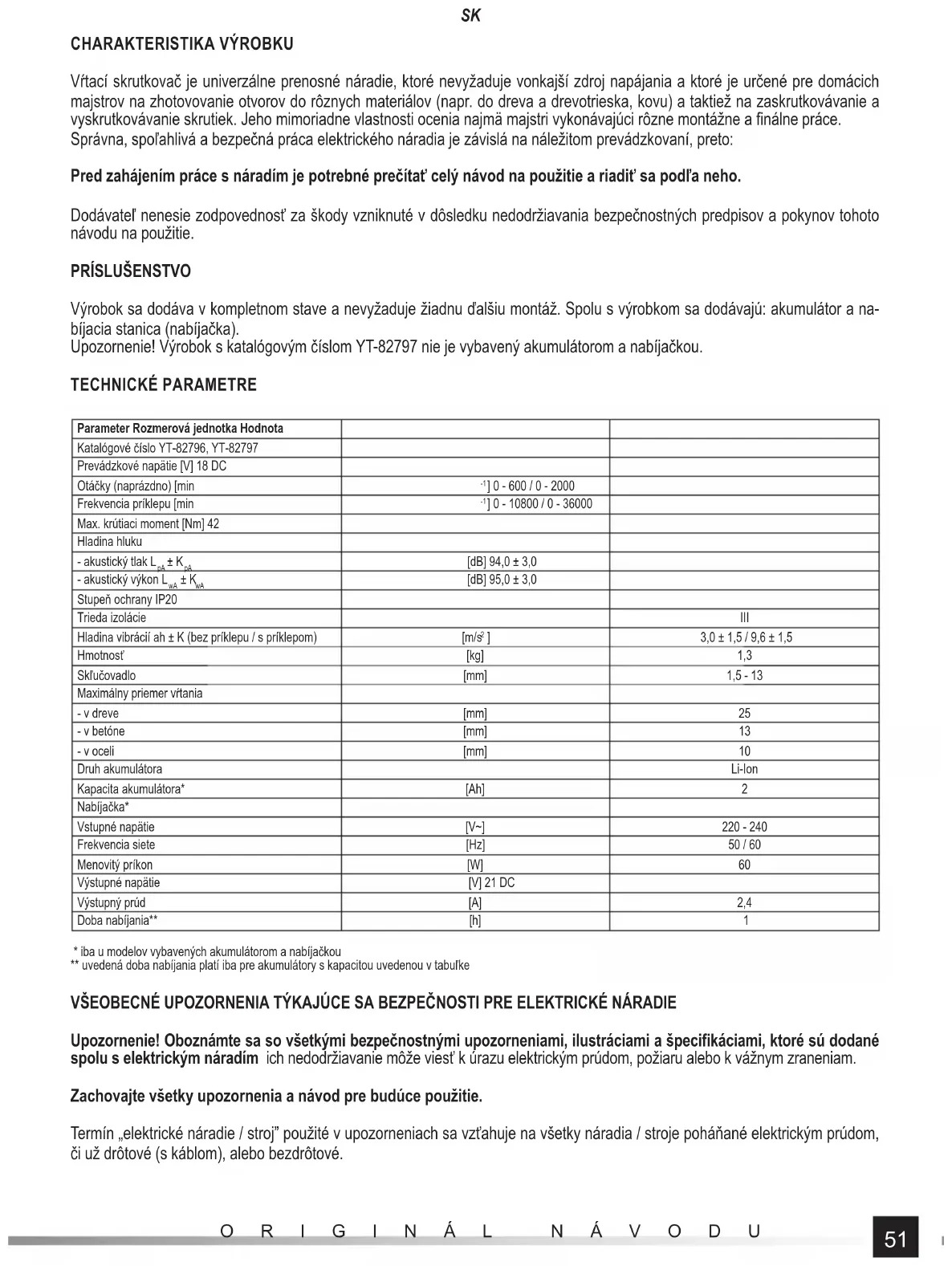 - iba u modelov vybavených akumulátorom a nabíjačkou ** uvedená doba nabíjania platí iba pre akumulátory s kapacitou uvedenou v tabuľke VŠEOBECNÉ UPOZORNENIA TÝKAJÚCE SA BEZPEČNOSTI PRE ELEKTRICKÉ NÁRADIE Upozornenie! Oboznámte sa so všetkými bezpečnostnými upozorneniami, ilustráciami a špecifi káciami, ktoré sú dodané spolu s elektrickým náradím ich nedodržiavanie môže viesť k úrazu elektrickým prúdom, požiaru alebo k vážnym zraneniam. Zachovajte všetky upozornenia a návod pre budúce použitie. Termín „elektrické náradie / stroj” použité v upozorneniach sa vzťahuje na všetky náradia / stroje poháňané elektrickým prúdom, či už drôtové (s káblom), alebo bezdrôtové.52
