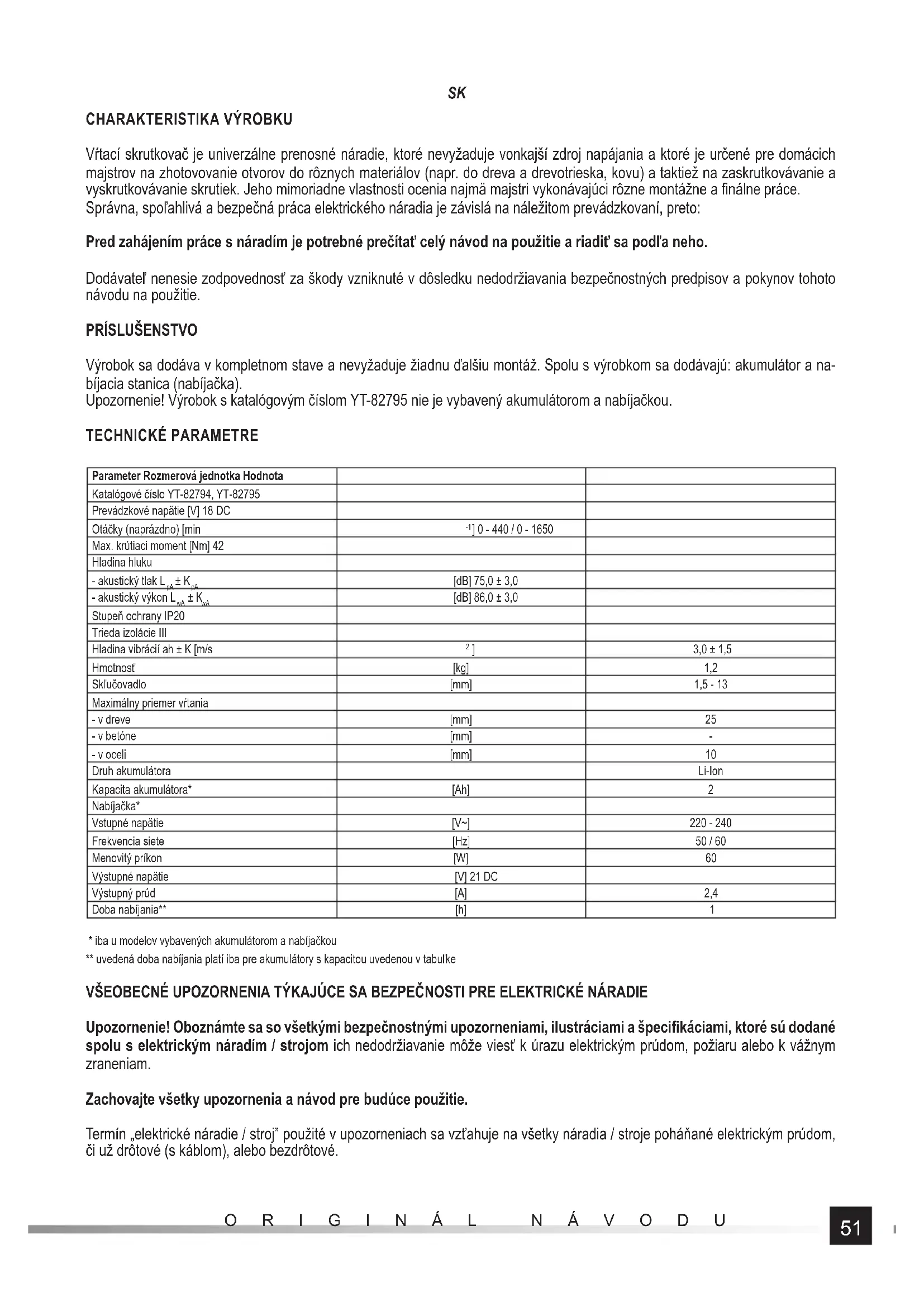 - iba u modelov vybavených akumulátorom a nabíjačkou ** uvedená doba nabíjania platí iba pre akumulátory s kapacitou uvedenou v tabuľke VŠEOBECNÉ UPOZORNENIA TÝKAJÚCE SA BEZPEČNOSTI PRE ELEKTRICKÉ NÁRADIE Upozornenie! Oboznámte sa so všetkými bezpečnostnými upozorneniami, ilustráciami a špecifi káciami, ktoré sú dodané spolu s elektrickým náradím / strojom ich nedodržiavanie môže viesť k úrazu elektrickým prúdom, požiaru alebo k vážnym zraneniam. Zachovajte všetky upozornenia a návod pre budúce použitie. Termín „elektrické náradie / stroj” použité v upozorneniach sa vzťahuje na všetky náradia / stroje poháňané elektrickým prúdom, či už drôtové (s káblom), alebo bezdrôtové.52