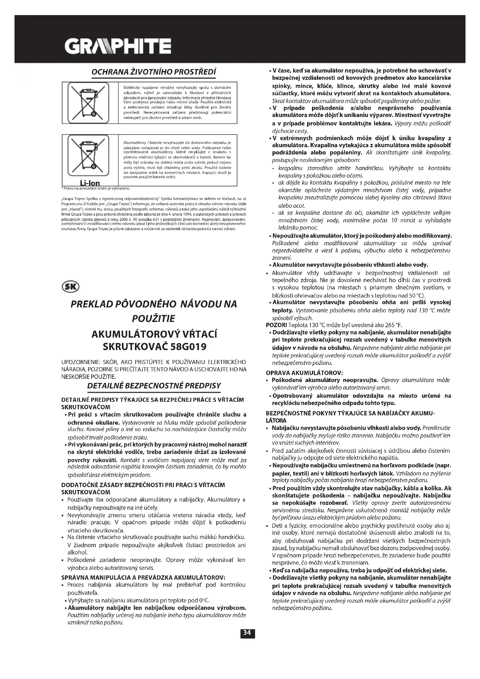 Rozsah rýchloupínacieho skľučovadla 2 -13 mm Rozsah regulácie krútiaceho momentu 1 – 16 + vŕtanie Max. točivý moment (mäkké vŕtanie) 38 Nm Max. točivý moment (tvrdé vŕtanie) 58 Nm Ochranná trieda III Hmotnosť 1,2 kg Rok výroby 2021 58G019 označuje tak typ, ako aj určenie stroja Akumulátor systému Graphite Energy+ Parameter Hodnota Akumulátor 58G001 58G004 Napätie akumulátora 18 V DC 18 V DC Typ akumulátora Li-Ion Li-Ion Kapacita akumulátora 2000 mAh 4000 mAh37 Rozsah okolitej teploty 4