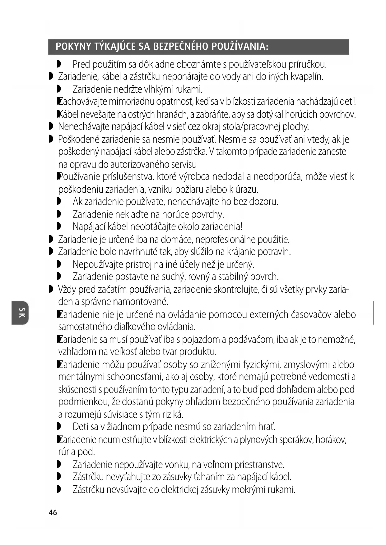 POKYNY TÝKAJÚCE SA BEZPEČNÉHO POUŽÍVANIA: Pred použitím sa dôkladne oboznámte s používateľskou príručkou. Zariadenie, kábel a zástrčku neponárajte do vody ani do iných kvapalín. Zariadenie nedržte vlhkými rukami.