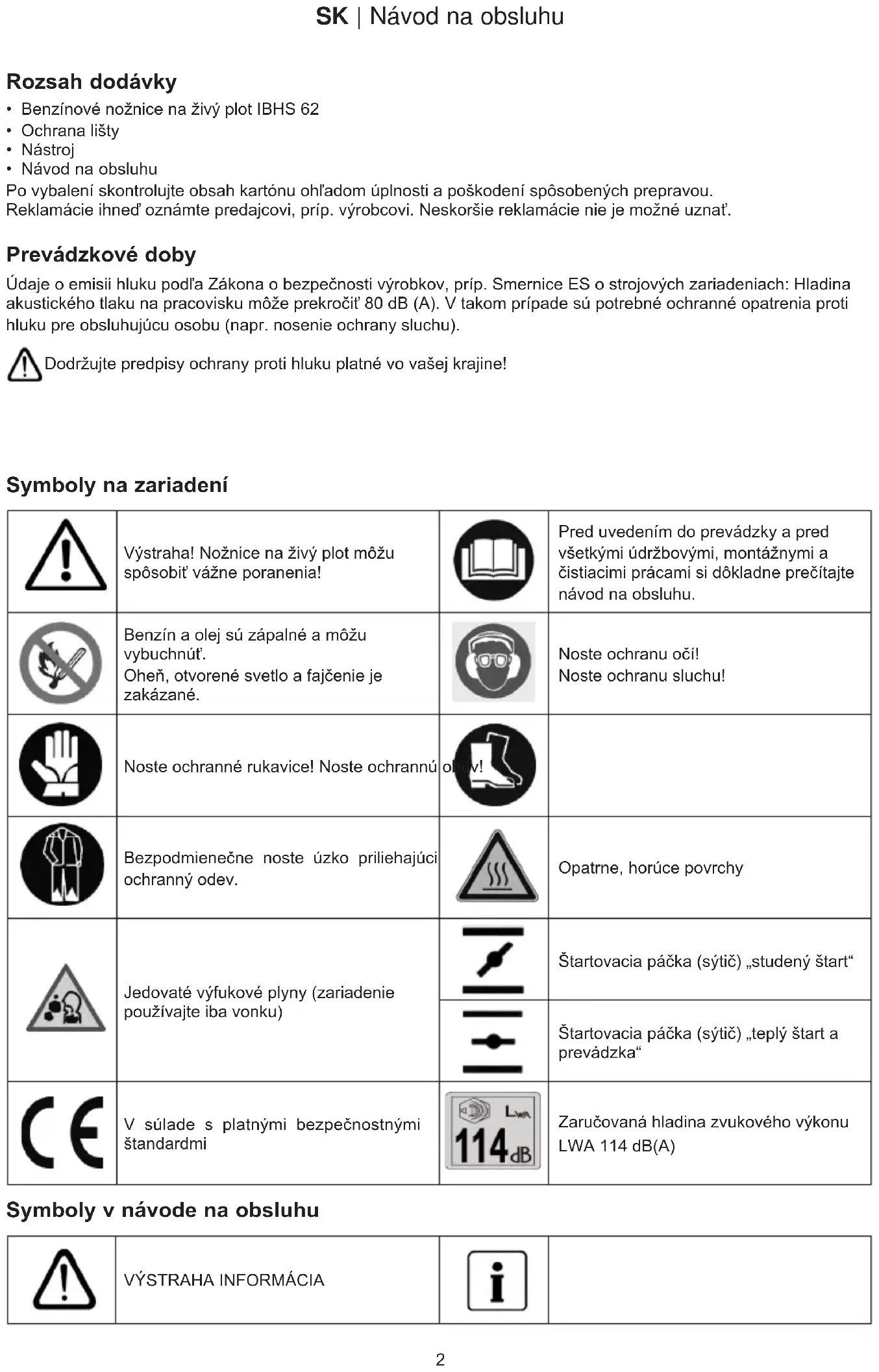 Vyhlásenie o zhode ES.............................................................................................. 14 Servis......................................................................................................................... Preklad pôvodného návodu na použitie2 SK | Návod na obsluhu Výstraha! Nožnice na živý plot môžu spôsobiť vážne poranenia! Pred uvedením do prevádzky a pred všetkými údržbovými, montážnymi a čistiacimi prácami si dôkladne prečítajte návod na obsluhu. Benzín a olej sú zápalné a môžu vybuchnúť. Oheň, otvorené svetlo a fajčenie je zakázané. Noste ochranu očí! Noste ochranu sluchu! Noste ochranné rukavice! Noste ochrannú obuv! Bezpodmienečne noste úzko priliehajúci ochranný odev. Opatrne, horúce povrchy Jedovaté výfukové plyny (zariadenie používajte iba vonku) Štartovacia páčka (sýtič) „studený štart“ Štartovacia páčka (sýtič) „teplý štart a prevádzka“ V súlade s platnými bezpečnostnými štandardmi Zaručovaná hladina zvukového výkonu LWA 114 dB(A) Symboly na zariadení